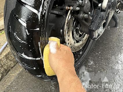 さて、一般的に洗車は「上から下に向かって」というのがセオリーだが、洗う箇所の確認と水の乾燥ということを考えれば下から上に向かって洗った方がラク。筆者の場合は、まずタイヤ回りを洗い、その後は「サスペンション」→「エンジン」→「タンク&シート」→「ハンドル回り」を洗っている。