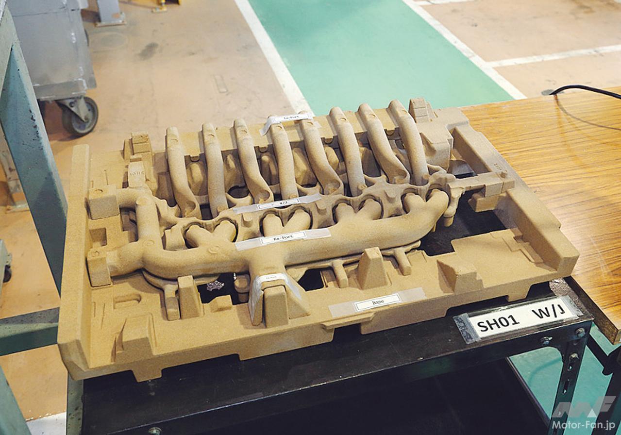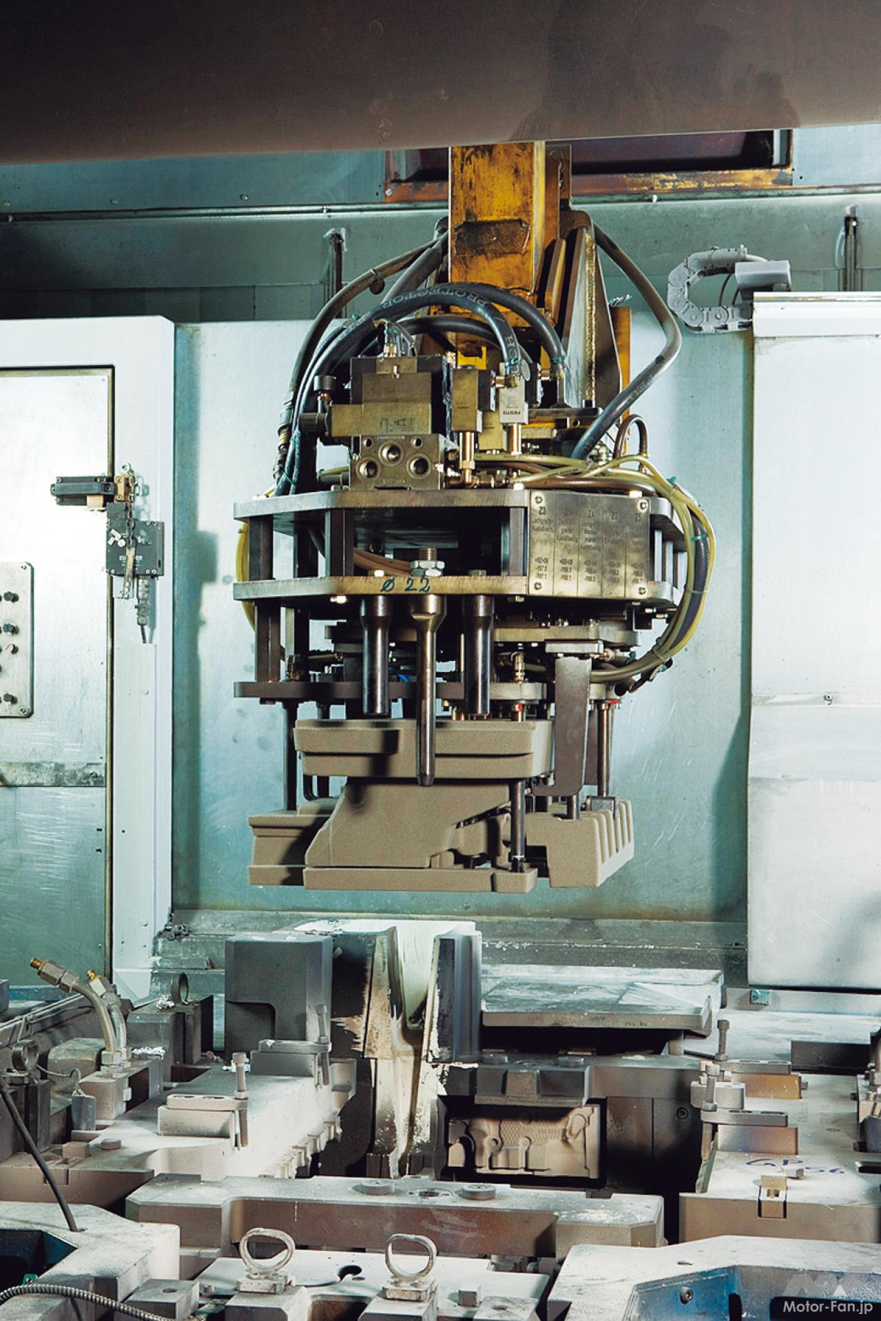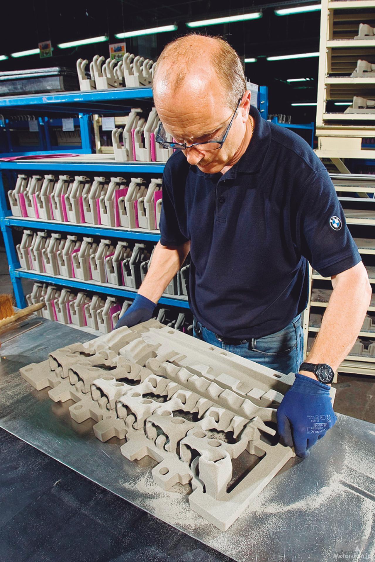 型を作り、そこに母材を投入するという製造手順はほかの鋳造と同じだ。近年は複雑な形状の中子を造れるようになり、製品の精度は極めて高い。同時に、高圧鋳造では不可能な細かい鋳込みが出来る。半面、砂型は製品と1対1だから製品の完成と同時に破壊される。つまり製品の数だけ砂型が要る。砂型鋳造を選択する条件は、エンジンの生産量とエンジンに求める性能や精度のバランスということになる。少量生産エンジンではいまだに砂型が主流であり、量産車ではマツダやBMWがこの方式である。ただし「砂型だからエンジンが優秀」なのではない。性能は設計で決まる。砂型鋳造は設計性能を得る手段のひとつなのである。