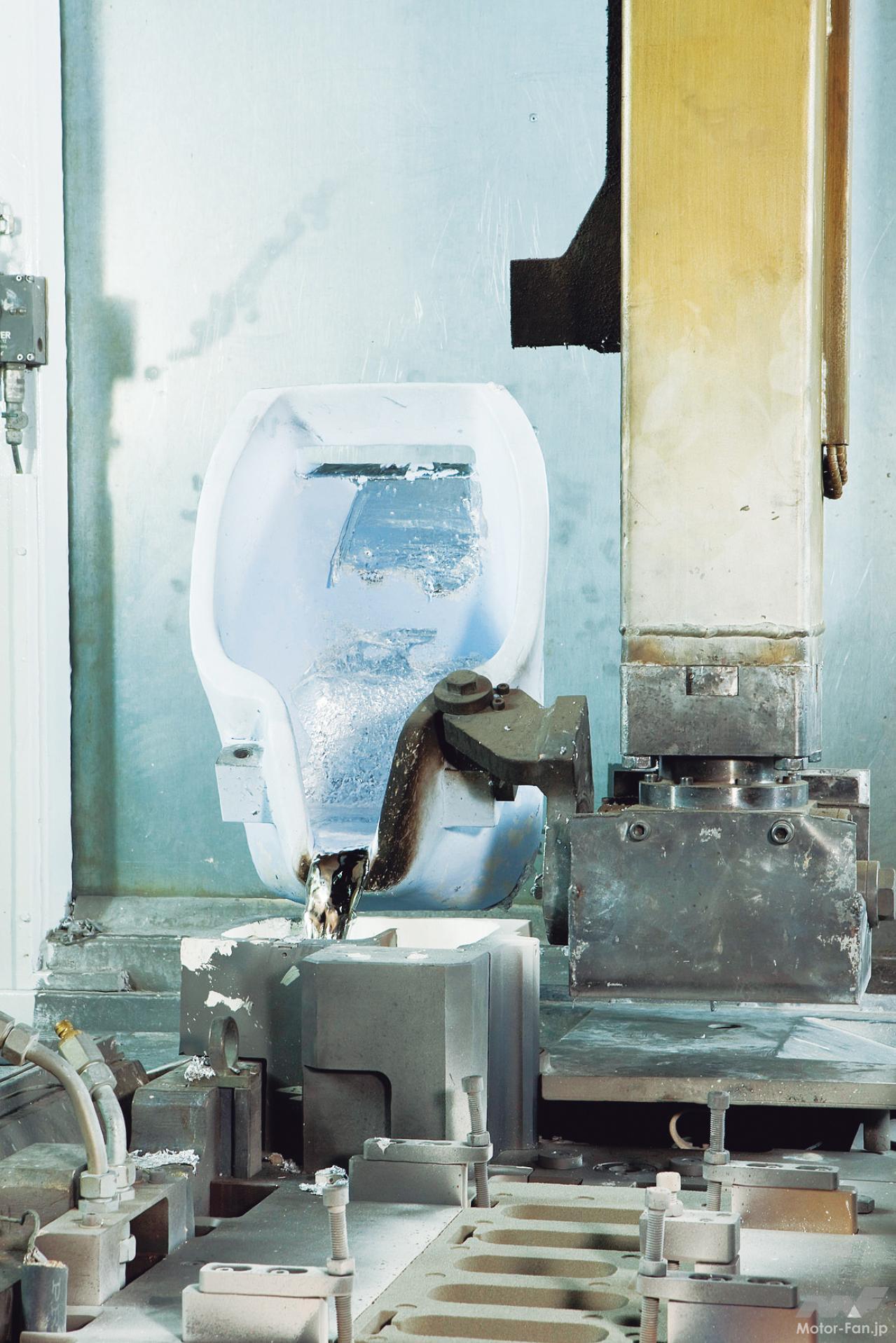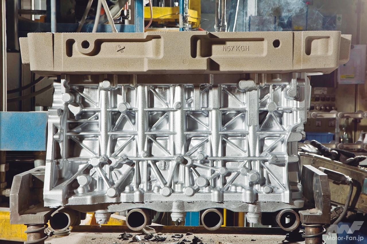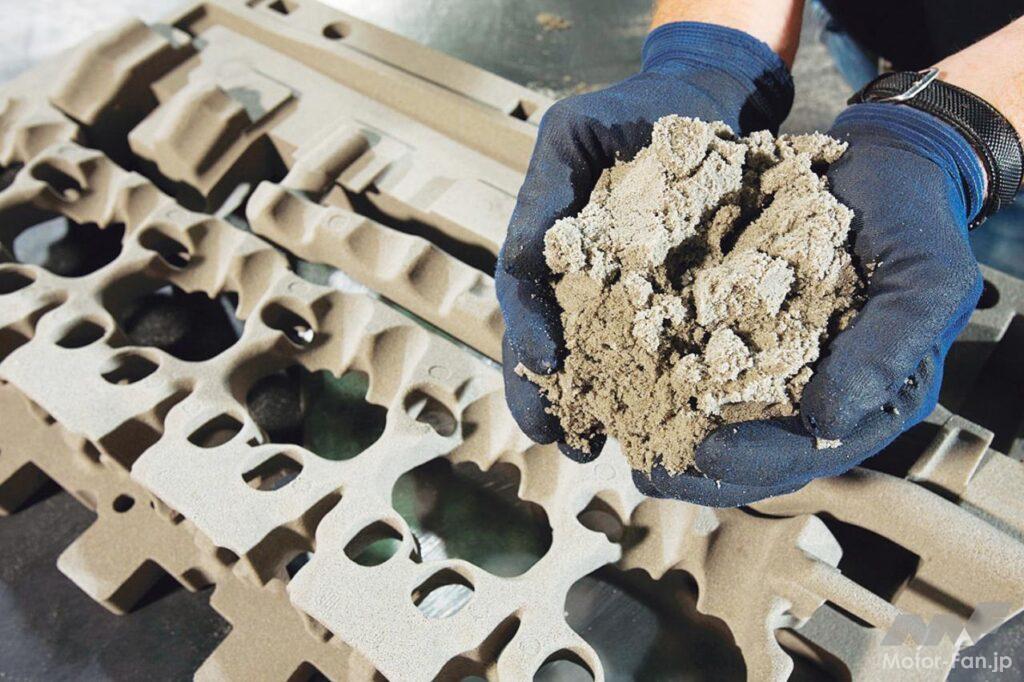 型を作り、そこに母材を投入するという製造手順はほかの鋳造と同じだ。近年は複雑な形状の中子を造れるようになり、製品の精度は極めて高い。同時に、高圧鋳造では不可能な細かい鋳込みが出来る。半面、砂型は製品と1対1だから製品の完成と同時に破壊される。つまり製品の数だけ砂型が要る。砂型鋳造を選択する条件は、エンジンの生産量とエンジンに求める性能や精度のバランスということになる。少量生産エンジンではいまだに砂型が主流であり、量産車ではマツダやBMWがこの方式である。ただし「砂型だからエンジンが優秀」なのではない。性能は設計で決まる。砂型鋳造は設計性能を得る手段のひとつなのである。