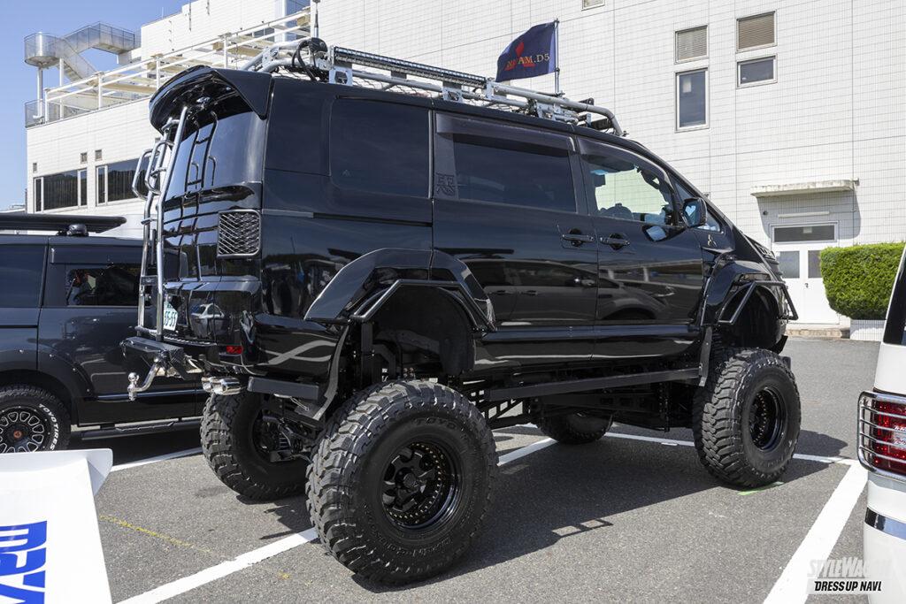 今年4月に山口県で行われたイベント、DDRでもその勇姿をアピールしていたgundam.d5さんの20インチリフトアップ車が岡山に参上!そびえ立つ、という表現がしっくり似合う超アゲアゲボディは何度見ても衝撃的。初めて見る方のために補足しておくと、リフトアップ関連のパーツ類はハートランドのフルワンオフ仕様で、タイヤは40×13.5サイズのトーヨー・オープンカントリーを装着。最近3ナンバー公認を取得している。
