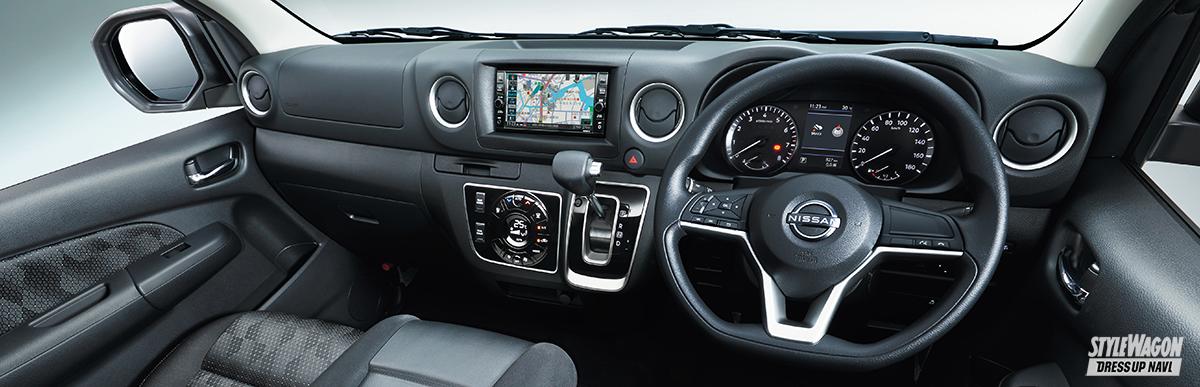 インパネまわりのデザインは、ソフトかつボリューム感を感じさせる乗用車感のある仕上がり。前方視界を安定して確保できる水平基調で、3型で刷新されたステアリングは、ハンズフリースイッチが付くほか、底辺が水平となるトレンドのDシェイプに。ワイドは助手席前が横に単純に長くなる。収納やトレイも複数完備。