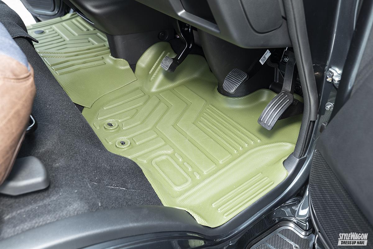 エクステリアで必見なのは、前後に搭載されたオリジナルのバンパーガード。フロントは中央ボトムAライン部のフチに台形のディンプルを連続で配置、そこをリベットで打ち留めたようなワイルドな仕上げ。格子状のグリルメッシュ風デザイン、ボトムのスクエアリブとの組み合わせによってタフな印象が絶妙に描き出されている。
