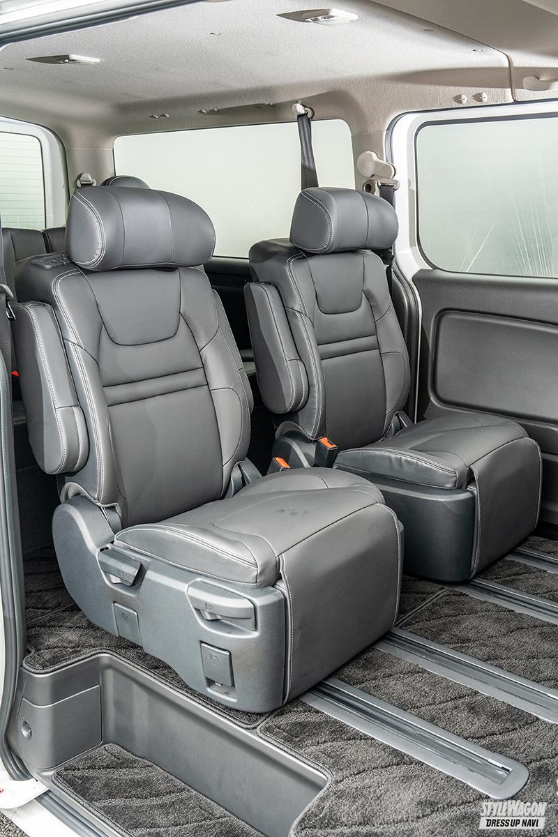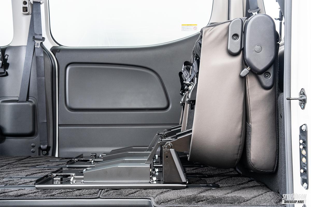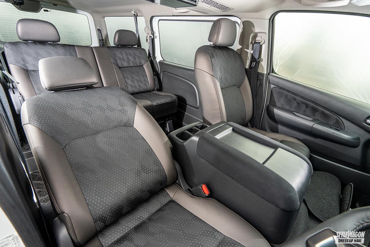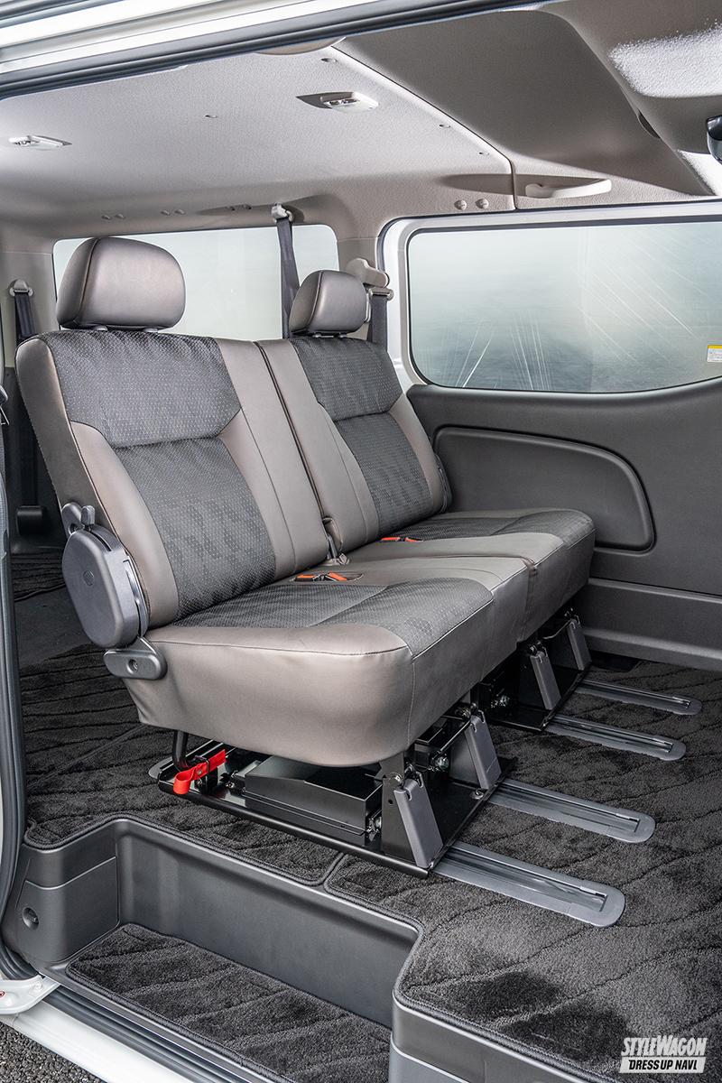ハイエース用で高い実績を誇るステルスは、キャラバン用の展開にもチカラを入れる。1&4ナンバーの貨物車を3&5ナンバーの乗用車へと正規登録するために開発した3列シートは、厳正なテストを繰り返して独自に開発したものだから安全性や信頼性も高く、その快適性の高さへの定評は満点だ。