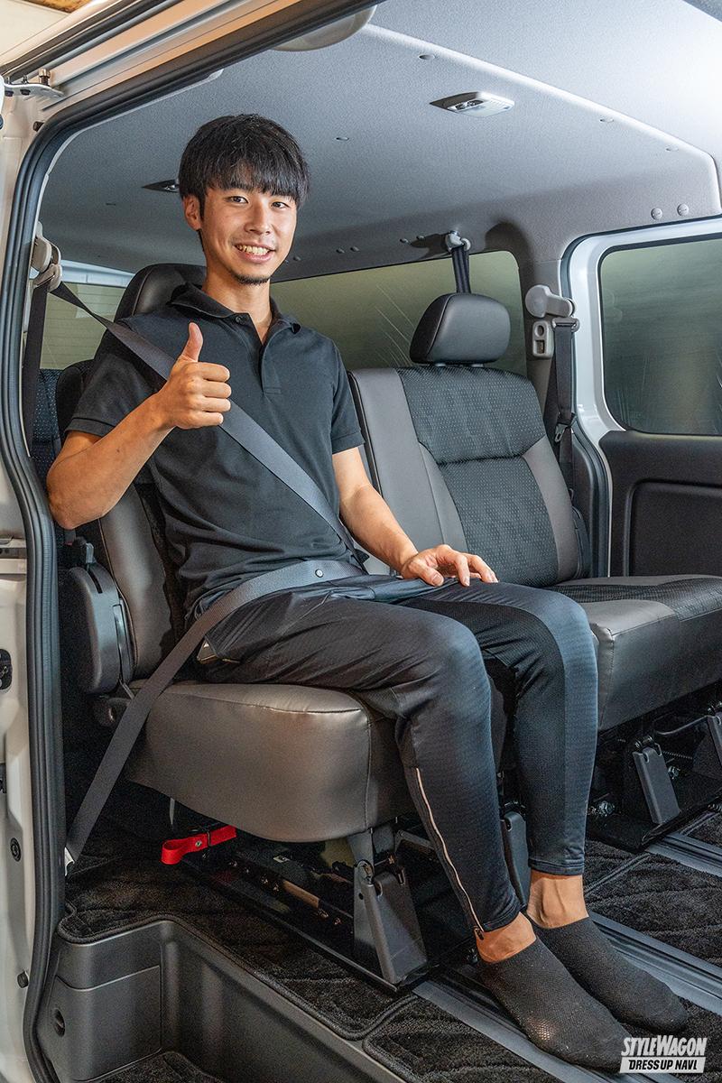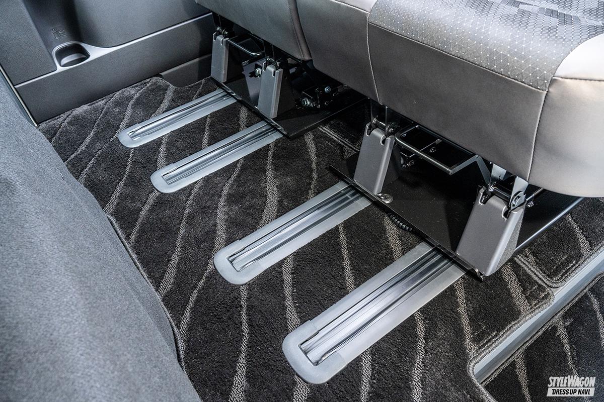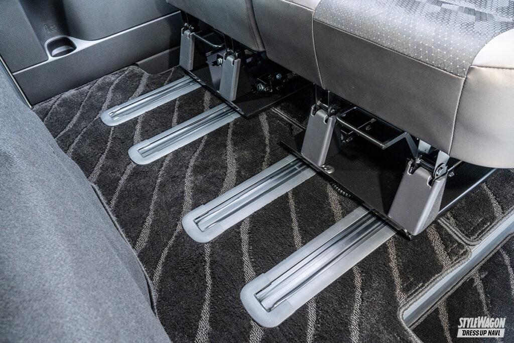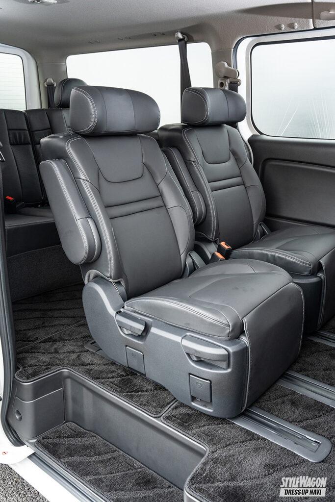 ハイエース用で高い実績を誇るステルスは、キャラバン用の展開にもチカラを入れる。1&4ナンバーの貨物車を3&5ナンバーの乗用車へと正規登録するために開発した3列シートは、厳正なテストを繰り返して独自に開発したものだから安全性や信頼性も高く、その快適性の高さへの定評は満点だ。