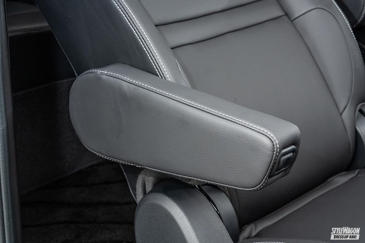 2列目に左右分割式のキャプテンシートを採用した7人乗りのリミテッドシリーズ。まるで飛行機のファーストクラス席のようなラグジュアリーな仕様で、ひじ掛けはもちろんオットマンまで標準装備されるから長時間の移動でも快適だ。シートレールも専用設計で、余裕たっぷりの前後スライドが可能なほか、左右席の幅を狭めるための横スライド機構も採用するなど、3列目シートへの乗り降りがラクになる工夫も施される。ヘッドレストは両端が持ち上がっているため、寝心地が良いのも特徴。