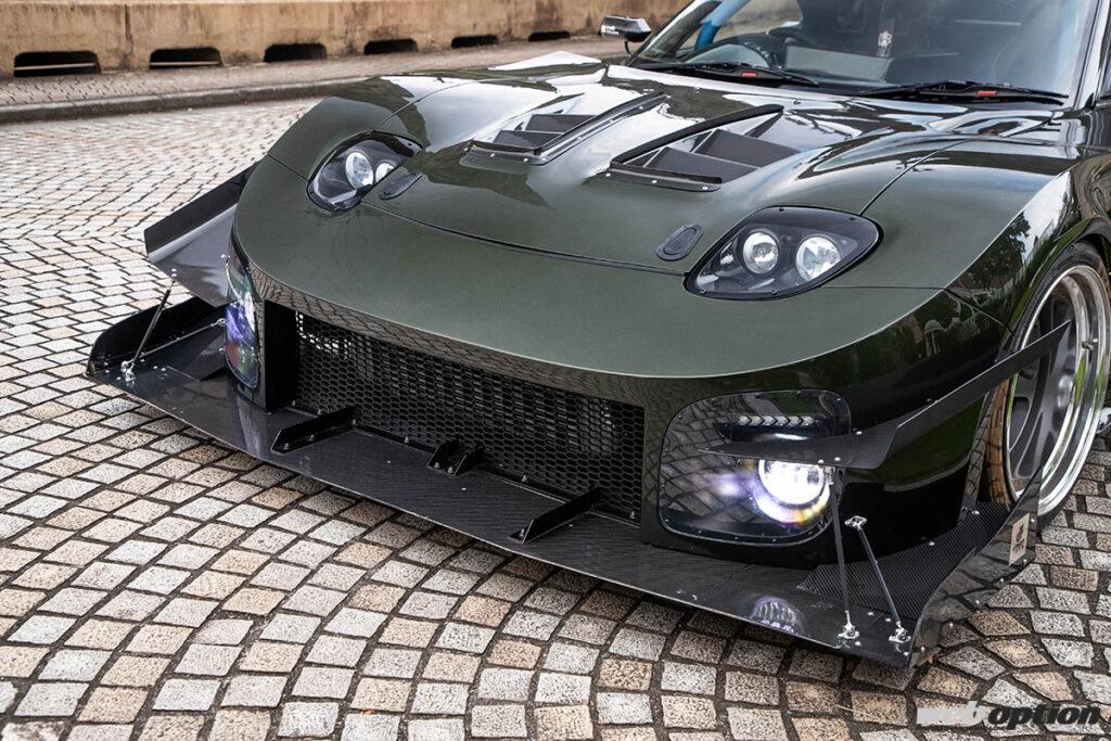 大型のフロントダクトにアンダーパネル、カナードなどで超攻撃的なルックスのフロントセクション。基本的な造形は米倉さんによるものだが、ドライビングライトは仕上げを依頼したA-BASEによるアイディア。また、ボリューム感のあるフェンダーラインに合わせて、ボンネットにも加工を加えている。