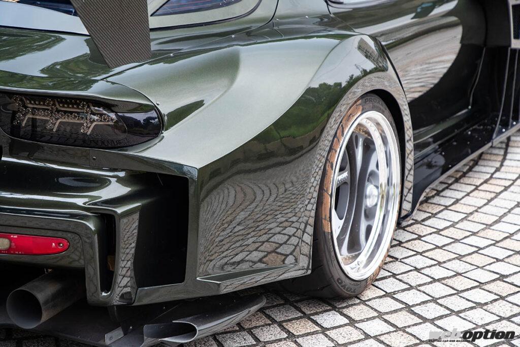 リヤフェンダーはTCPマジックの製品がベースだが、使っているのはボディとの接合部分くらいで、ほぼ原型は留めておらず、後方にはタイヤハウスからつながるエア抜きダクトを配置。リヤバンパーはユーラスのタイプGTがベースで、こちらはほとんど加工していない。
