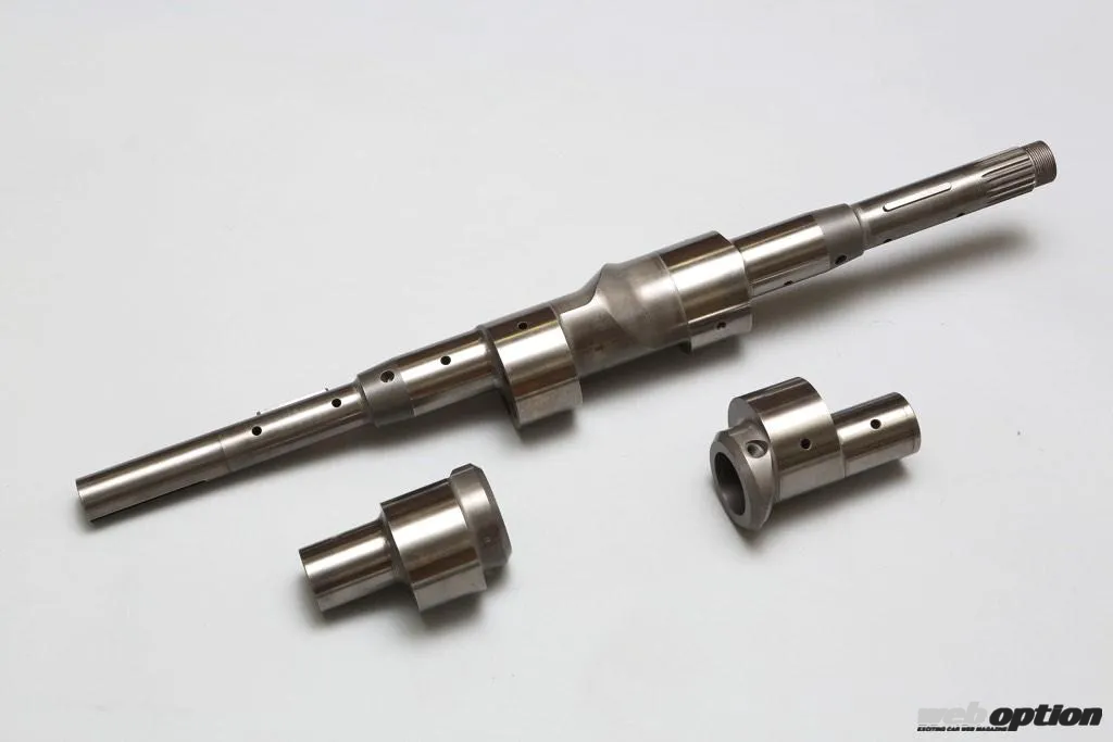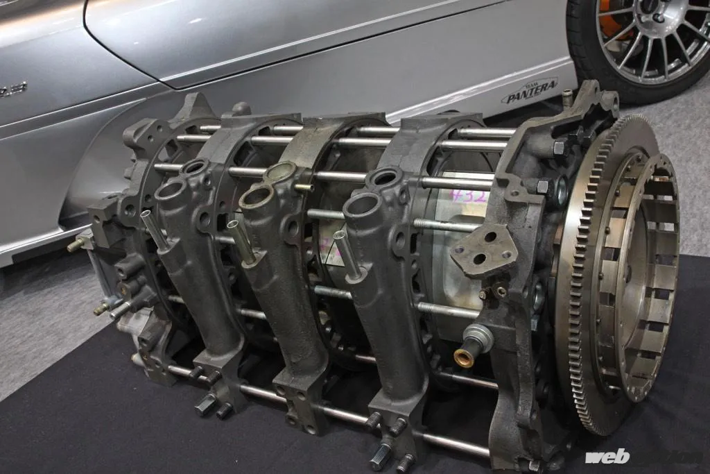 とはいえ、このマシンに搭載されたシロモノは、R26Bとは全く異なる完全オリジナルのユニット。軸となるエキセントリックシャフトは12A用ベースのワンオフ2分割モデルとし、ローターは13B用よりも10mm薄型で回転慣性に優れる12A用を採用。そこにペリフェラルポート化された12A用ローターハウジング&サイドハウジング計9枚をサンドイッチすることで、3ローターの20Bユニットとほぼ同寸の、687mmというコンパクトな12A型4ローターユニット(2296cc)を造り上げたのだ。