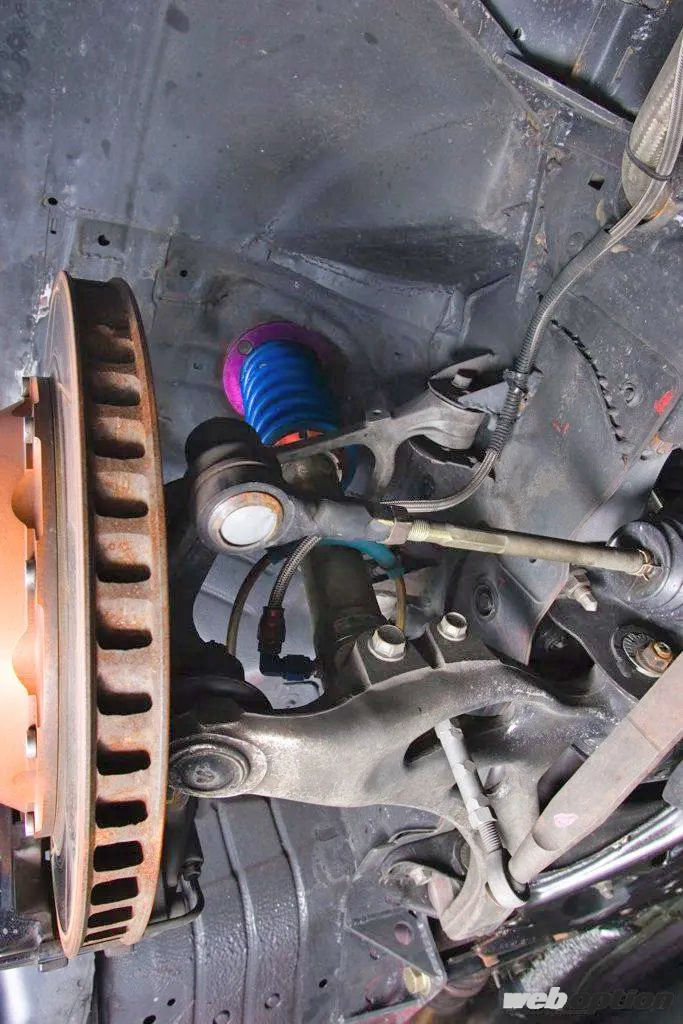 また、アーム類は前後ともに取り付け位置を変更し、75mmの車高ダウン値で最適なジオメトリーを実現している。なにより特徴的なのはフロント。ハイレートのスタビを導入しているため、アッパーアーム前側の取り付け位置のみを75mmアップさせて荷重移動を起こしやすくしているのだ。