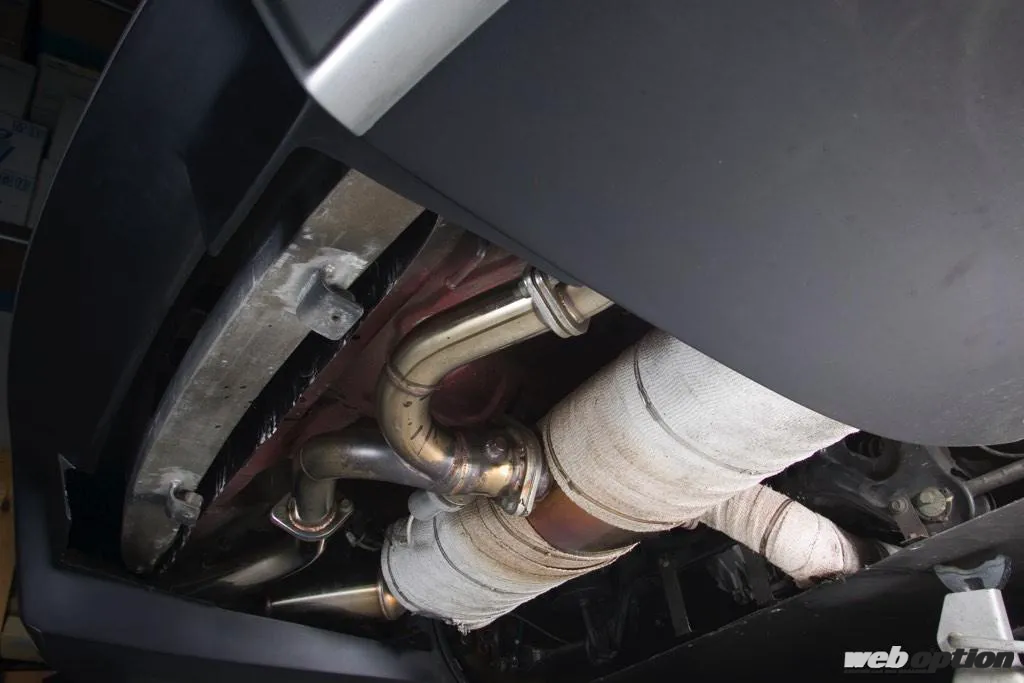 排気レイアウトも独特だ。80φのメインパイプはまず横置の大型サイレンサーへと繋がる。そこからそれぞれアイドリング時に機能するサイドマフラーと、全開時に機能するセンターマフラーへと分岐し、テールエンド直前で再び集合する。音質を追求した結果の産物だ。