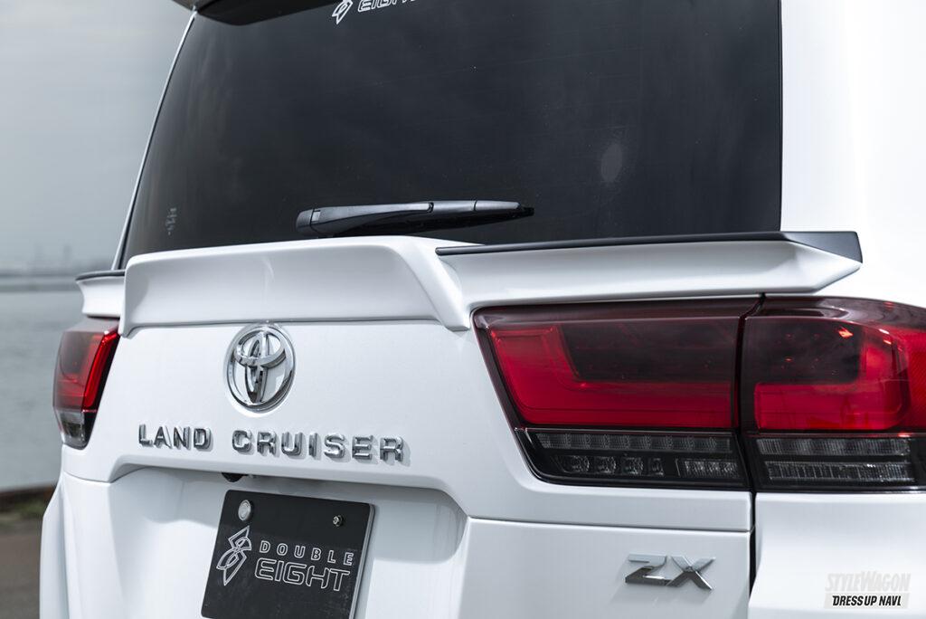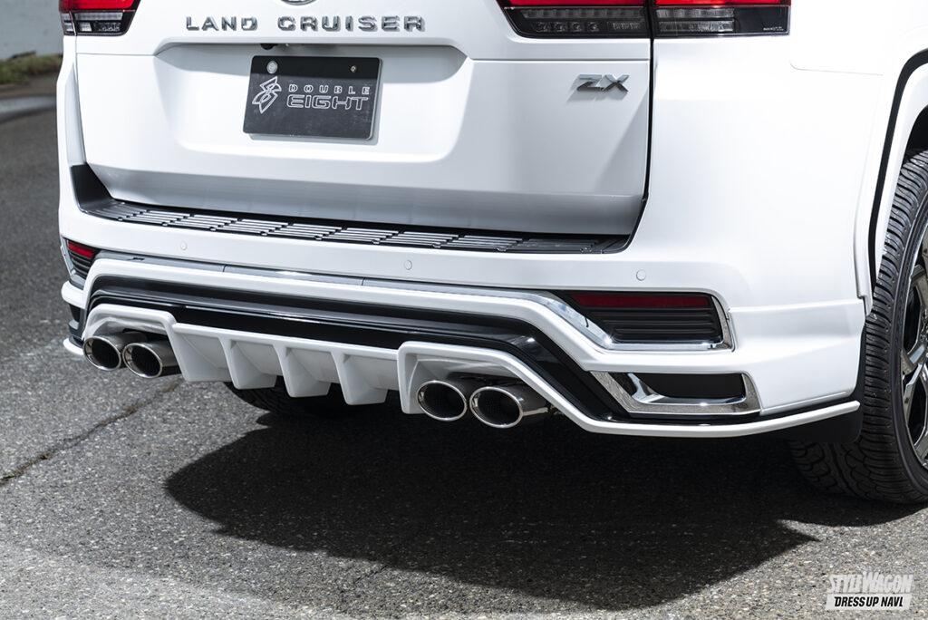 そんなダブルエイトからランクル300オーナー待望のモデリスタバージョン用ボディキットが登場。ランクル300購入者の多くがモデリスタのエアロ付きを選ぶという現状から、モデリスタバージョン用エアロの登場が待たれていたのだ。モデリスタのエアロといえばメッキパーツというイメージが強いが、ランクル300用はメッキは控え目に、立体的なデザインで魅せるフォルムを採用している。