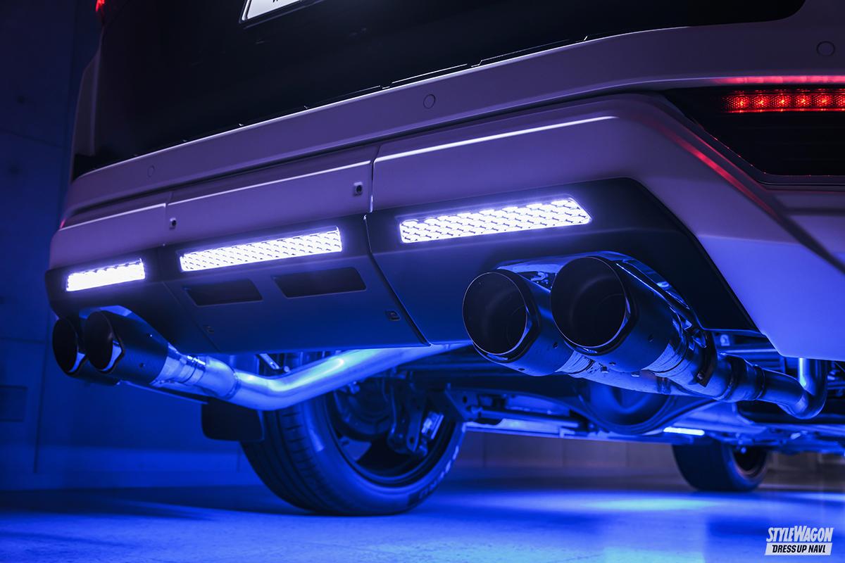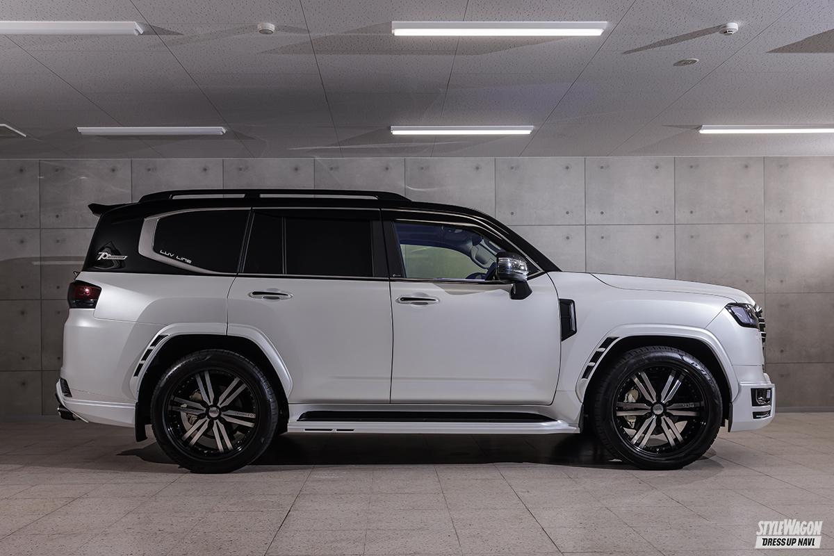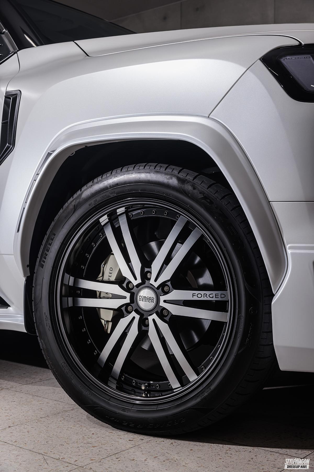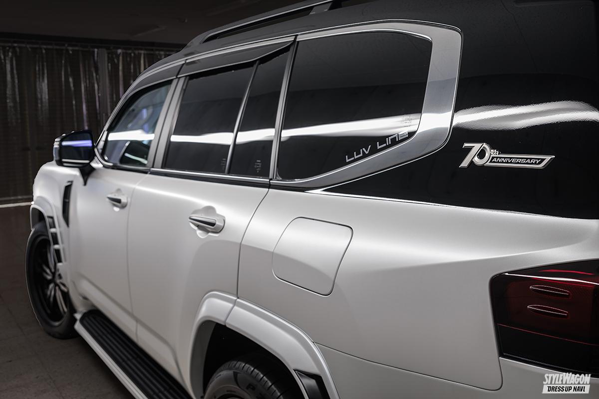 第一のポイントはボディメイクだ。エムズスピードのフルエアロで揃え、純正よりもインパクトを増したラグジュアリーでアーバンなスタイルを形作っている。そんな全身を包み込むラッピングが、第二のポイント。フルラッピングをかけているのだが、なんと上半分と下半分で施工内容を分けているという。上部はツヤあり、下部はツヤなしにしているのだ。質感の違うラッピングを組み合わせることで他にはない雰囲気を醸し出すことに成功している。