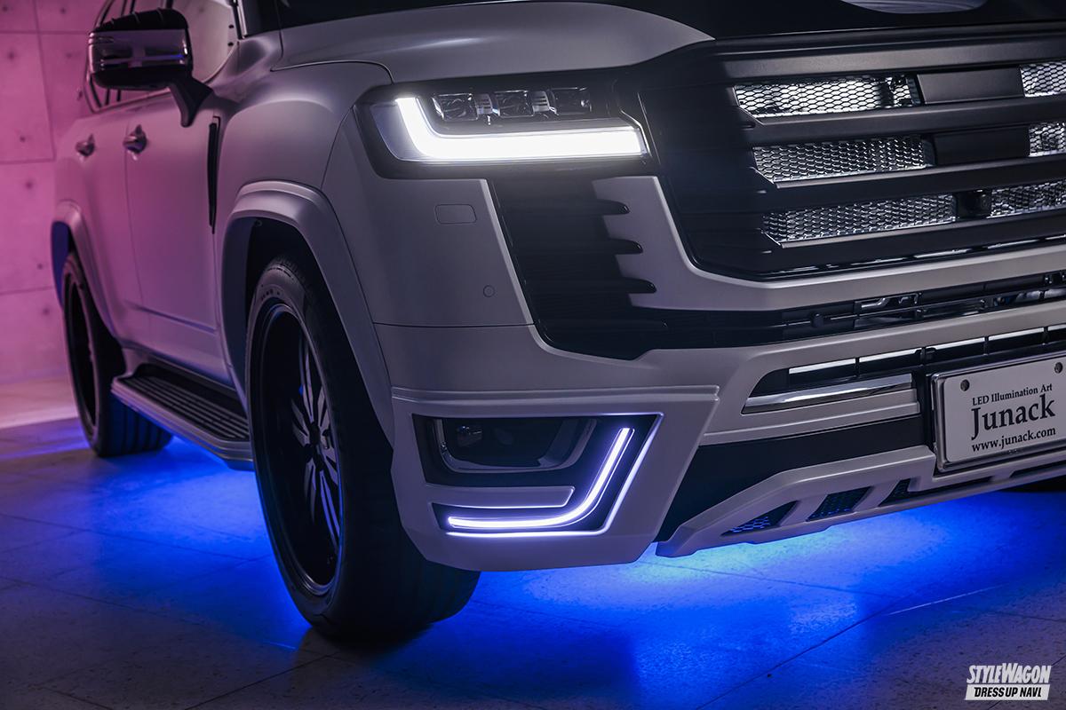そして最後の見所がライティング。アンダーライトやロゴのライトアップ、ダクトの中にまでライトを仕込むなどポイントよく光らせている。施工ショップはジュナックだ。だが、ちょっと待って欲しい。ジュナックといえば東京の三鷹市にあるショップ。真野さんの住まいは愛知だ。実に350キロ以上も離れている。この行動力こそが真野さんの真骨頂と言っていいだろう。良いショップがあると聞けばどこへでも出かけていく。自分で徹底的に調べて、満足いくクルマを作りあげていく。このランクルが映しているのは、妥協なき姿勢と強い意志。それこそが真野さんの持つパーソナリティと言って良いのだろう。