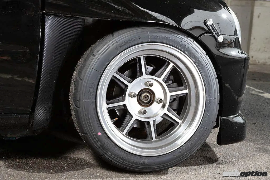 コンセプトは「昭和のヤン車」ということで、ホイールはハヤシレーシング(7.0J+7)を選択。タイヤは前後ともに165/55-14のアドバンA050を合わせる。