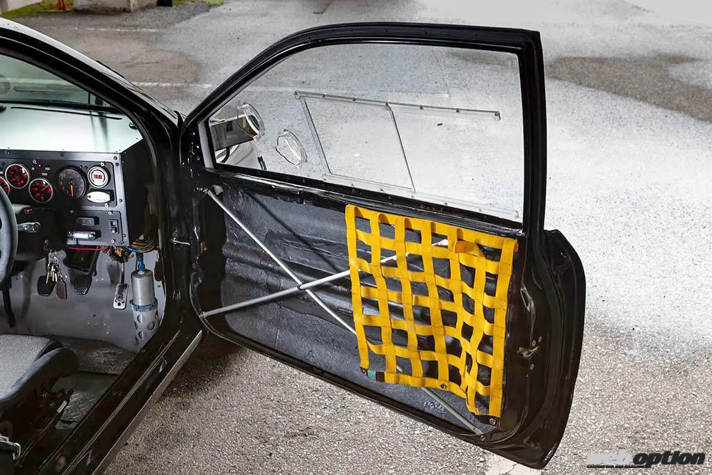 左右ドアパネルは、スーパーGTマシンを真似て着脱式に改造。軽量化重視のFRP性のため、クロスバーをセットして補強を行なっている。さらにガラス類もポリカーボネイト製とするなど軽量化を徹底。車重は衝撃の500kgだ。