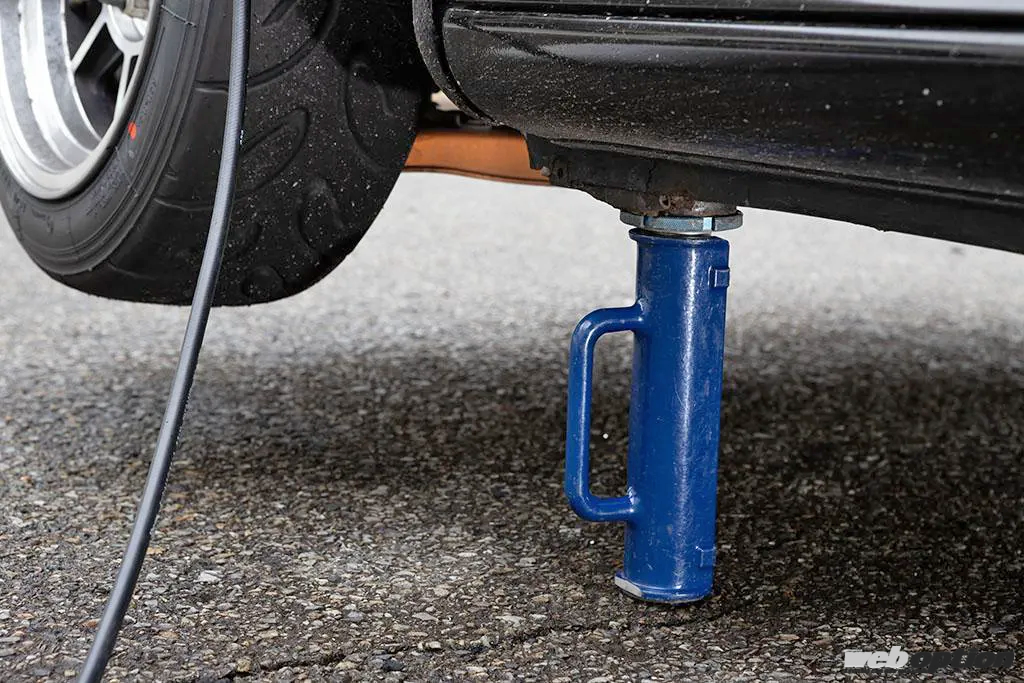 軽量マニアのオーナーだが、重量増となるエアジャッキを搭載しているのはレーシングカーを意識した完全なネタ装備。「通常のコンプレッサーでは圧が足りず、稼働させるためには専用ボンベを持ち運ぶハメになったのは誤算でしたね」と笑う。