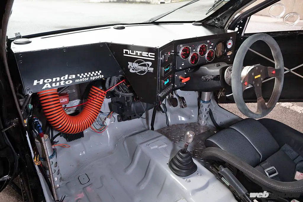 戦闘機のコクピットを思わせるダッシュボードはワンオフ品。タコメーターは永井電子のウルトラで、サブメーターはDefiをチョイスするが、走行中の数値はコンソールに装着したDefiリンクディスプレイで確認。燃料計とスピードメーターはバイク用のデジタルタイプだ。コンパクトで見やすいのがお気に入りとか。ステアリングはMOMOのバックスキン、シートにはレカロのフルバケットシートを奢る。