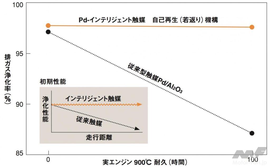 従来は、長期間にわたって触媒の能力を維持するために貴金属そのものの量を増やしていた。これはコストアップにつながるが、各国で決められた「触媒耐久試験」を好成績でパスするためには貴金属の増量が必要だった。