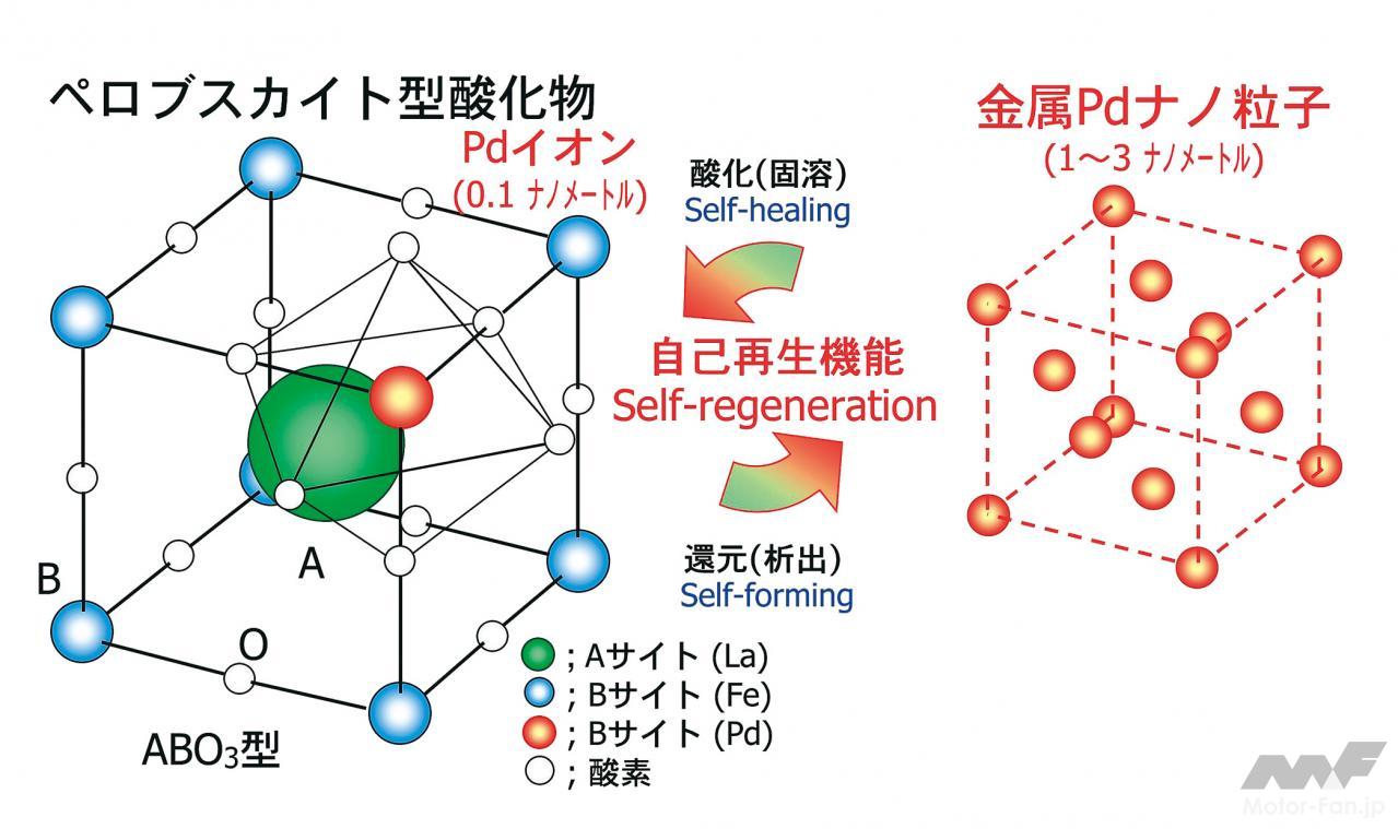 この結晶構造をダイハツは「ペロブスカイト型酸化物」と名付けた。もともとペロブスカイトは灰チタン石と呼ばれる物質で、金属を中心に周囲を酸素原子6個が取り囲む構造を8面体の中に含有したものだ。ダイハツのペロブスカイト酸化物は、パラジウムイオンが8面体そのものの一角を形成し、その周囲を6個の酸素原子が取り囲んでいる。この構造により、パラジウムは「長く」仕事をすることができるようになった。結果としてパラジウム使用量が10分の1に減少したのだ。
