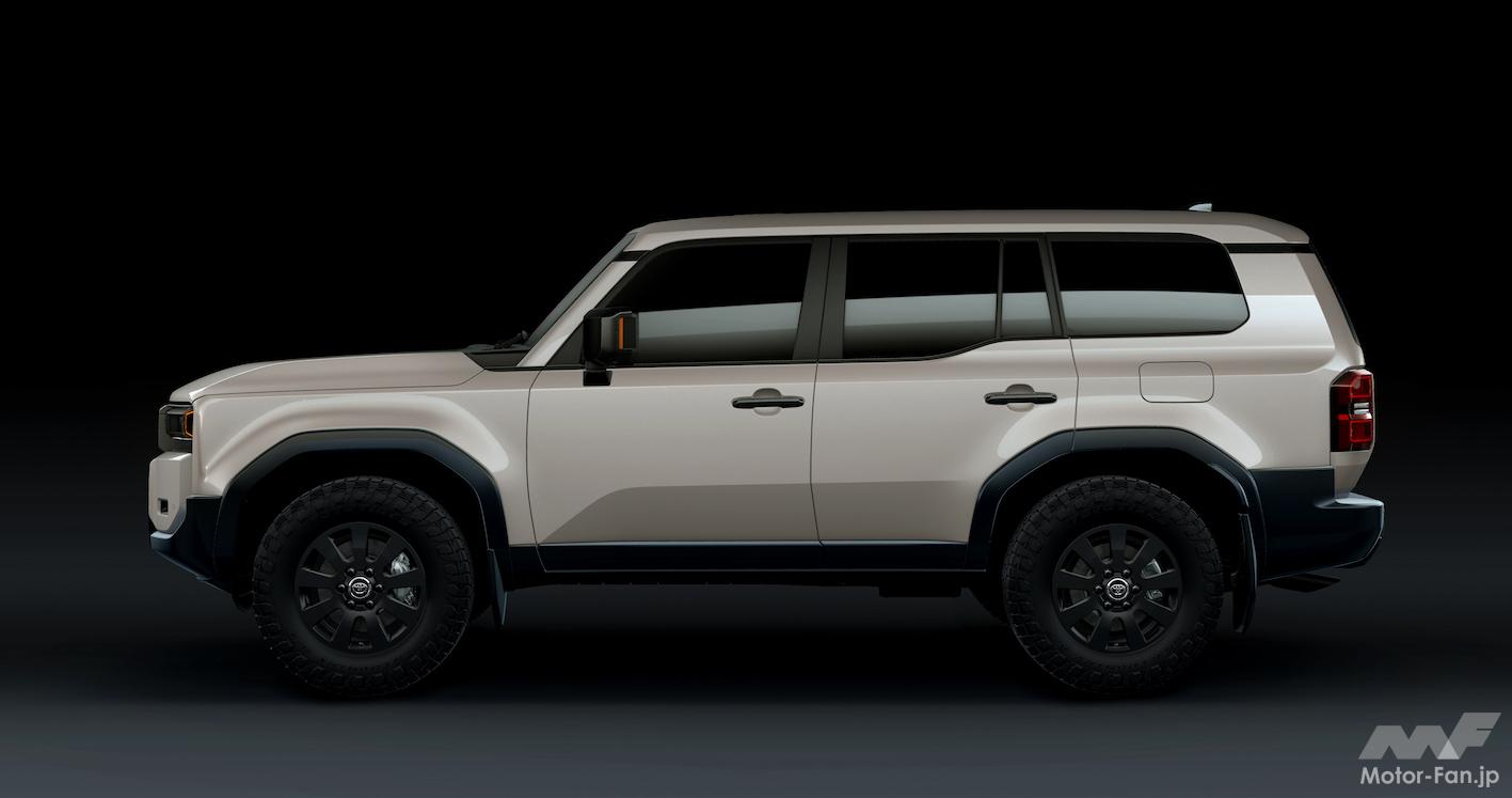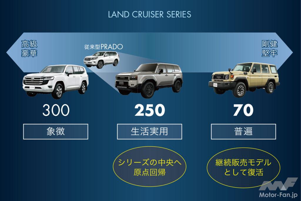 ランクルは今般のトヨタの分類では、常に最新技術を導⼊しフラッグシップとして進化を担うステーションワゴン(現行最新は“300”シリーズ)、⾼い耐久性、⾛破性が求められるヘビーデューティーモデル(現行最新は“70”シリーズ)、悪路⾛破性をベースに扱いやすさと快適性を付与し、⼈々の⽣活と実⽤を⽀えるライトデューティーモデル(いわゆる“プラド”系)の3シリーズで展開されてきたが、今回発表の新型“250”シリーズはライトデューティーモデルになるという。つまり新型“プラド”とも言えるのだが、そのコンセプトは明確に“原点回帰”。それゆえに今回の新型は“プラド”を名乗らなかった。