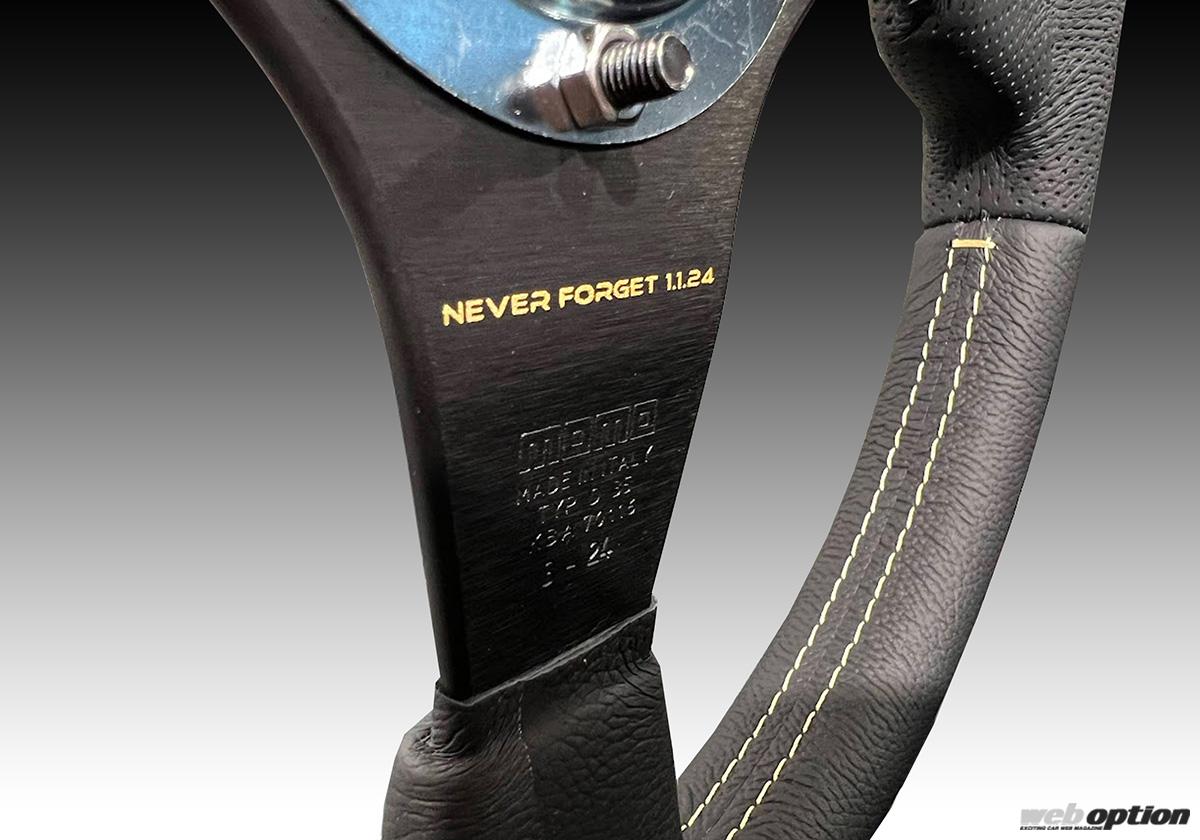 ベースとなっているのはMOMOの定番モデル“RACE”で、輪島塗をイメージしたブラック×ゴールド仕様。スポーク裏には「NEVER FORGET 1.1.24」の刻印が施されている。