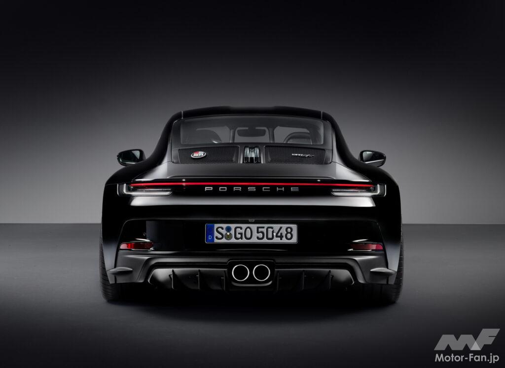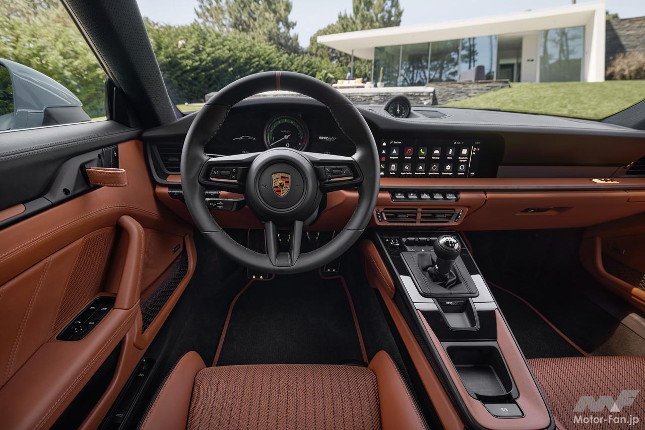 インテリアには、クラシックコニャックにブラックのピンストライプをあしらった布製シートセンターが採用されており、伝統に敬意を払う。ツートンカラー(ブラック/クラシックコニャック)のセミアニリンレザートリムとエクステンデッドレザー仕上げ、パンチング加工が施されたRace-Texのルーフライニング、およびポルシェエクスルーシブマニュファクチャーのその他のエレメントもこのパッケージに含まれる。リヤの“Porsche”ロゴと“911 S/T”モデルロゴはゴールドだ。ヘリテージデザインパッケージの価格は税込みで262万2000円。