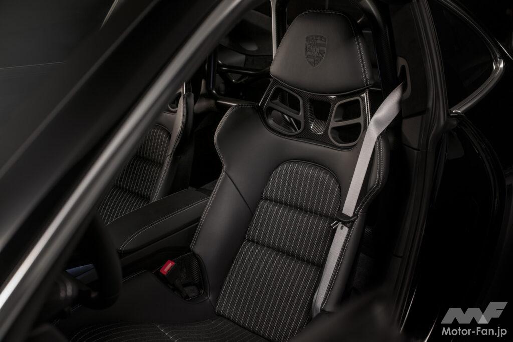 CFRP製フルバケットシートも標準装備され、追加料金なしで4ウェイ調節機能付スポーツシートプラスが装着可能だ。インストルメントクラスターとスポーツクロノパッケージの時計は、クラシックなグリーンのポルシェカラーで仕上げられている。