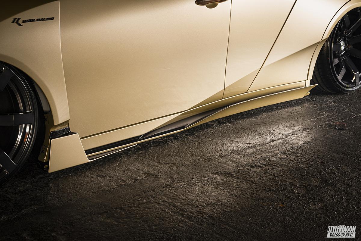 下まわりのボディキットはすべて、このワイドフェンダーとの整合性にこだわった作り。フロントは純正バンパー下にアンダースポイラーを装着し、さらにその底面に薄型フラップディフューザーをレイヤードすることでワイド化を実現。純正バンパー両端にはワイドフェンダー用バンパーカバーも用意する。