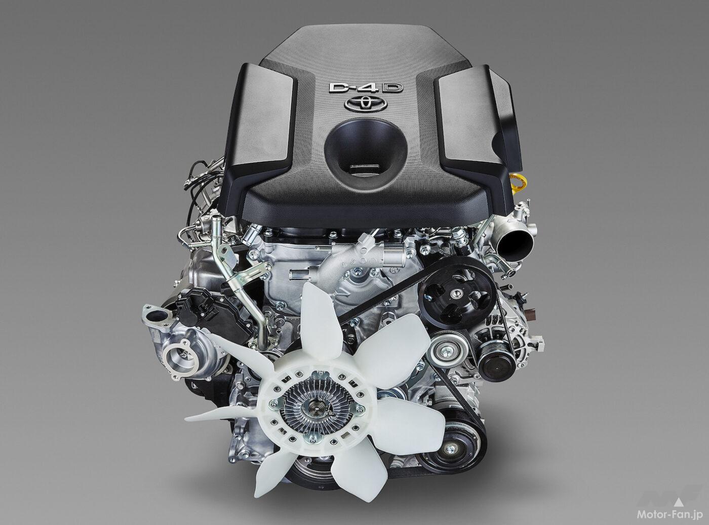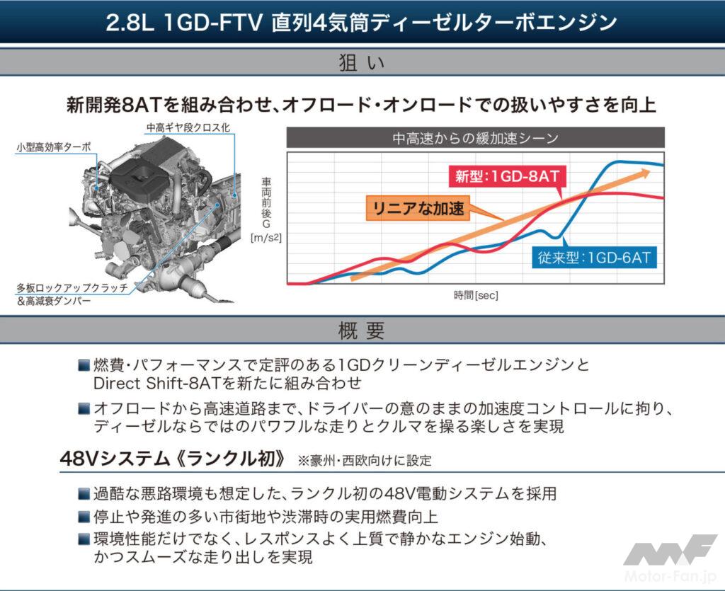 1GD-FTV型 エンジン形式:2.8L直列4気筒DOHCディーゼル ターボ排気量:2754cc ボア×ストローク:92.0mm×103.6mm 圧縮比:15.6 燃料供給システム:コモンレール(2200bar ソレノイド) 過給システム:VGターボ×1 可変動弁:EX:VVT EGR:HP/LP 最高出力:204ps(150kW)/3000-3400rpm 最大トルク:500Nm/1600-2800rpm 排気後処理装置:DOC+DPF+SCR トランスミッション:8AT (スペックは一部従来型ランドクルーザープラドのもの)