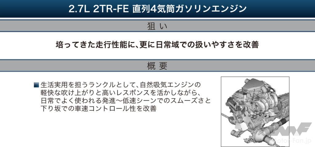 2TR-FE型 エンジン形式:2.7L直列4気筒DOHC 排気量:2693cc ボア×ストローク:95.0mm×95.0mm 圧縮比:10.2 吸気方式:自然吸気 燃料供給システム:PFI 可変動弁:吸気側VVT 最高出力:163ps(120kW)/5200rpm 最大トルク:246Nm/3900rpm トランスミッション:6AT (スペックは一部従来型ランドクルーザープラドのもの)