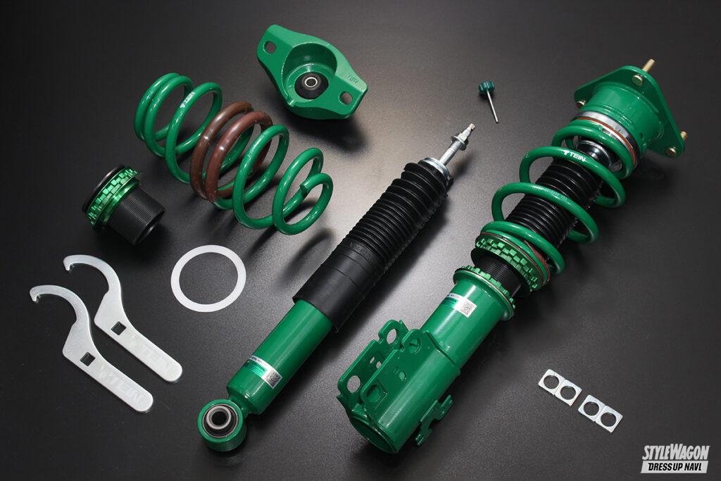 老舗足まわりメーカーのテインが誇る、ストリート系車高調のフラッグシップモデルがRX1。全長調整式に減衰力調整機構付きとローダウン派が求める機能を抜かりなく導入しつつ、特許技術のハイドロバンプストッパーを採用しているのが最大の特徴。フル乗車や多くの荷物を積んだ状態で段差を乗り越えた時の突き上げや跳ね返りを抑え、スムーズに収束する。またショックはオイルの量を多く確保できる複筒式により、乗り心地を向上。ミニバンなどファミリーカー用とのラインアップが充実しているモデルだからこそ、乗り味の良さにこだわった。