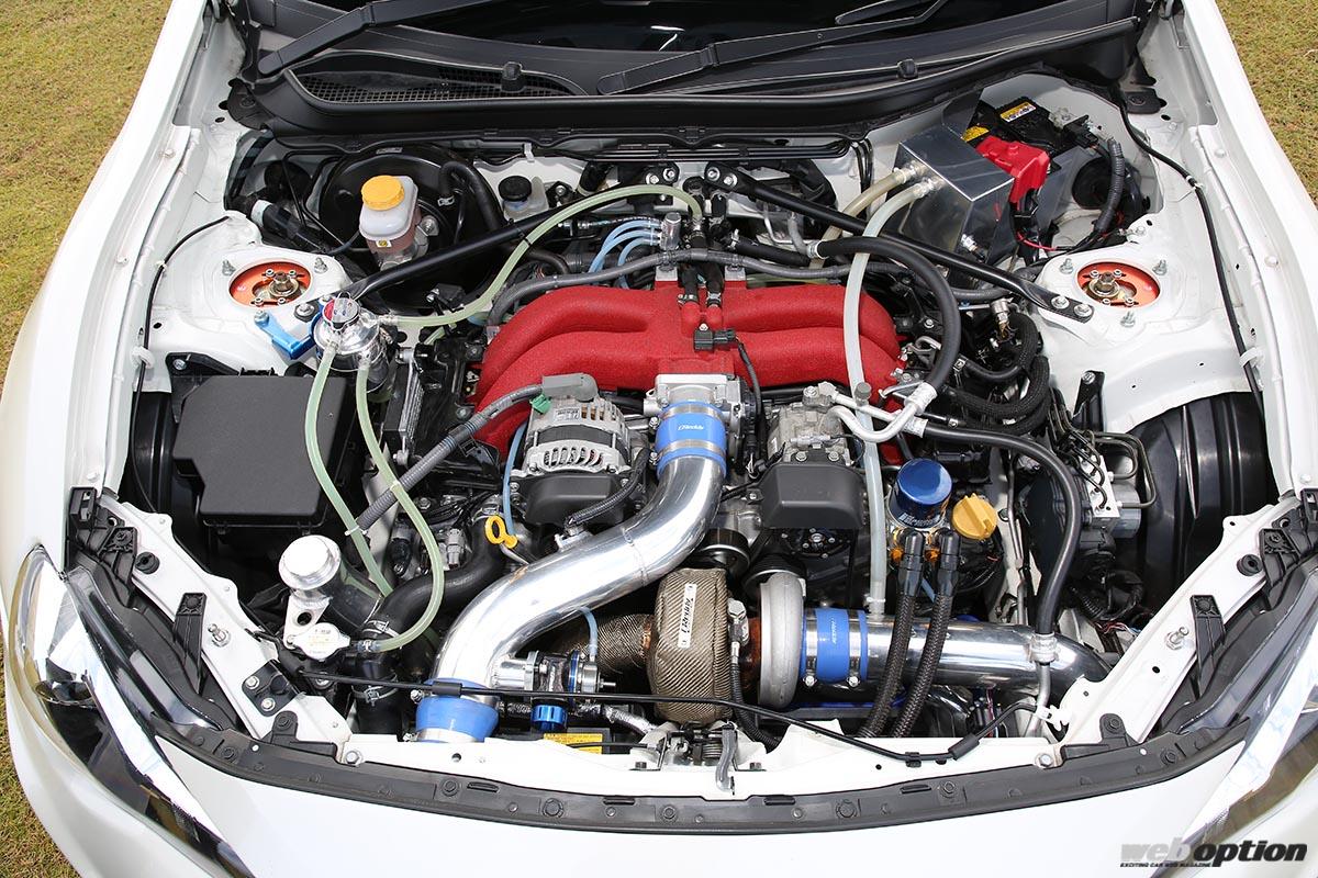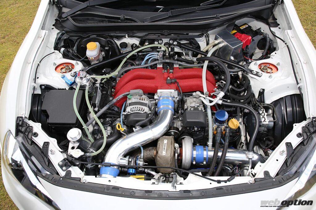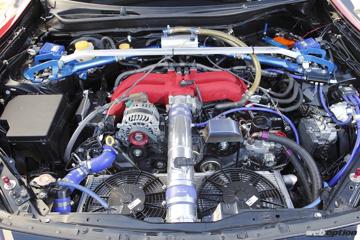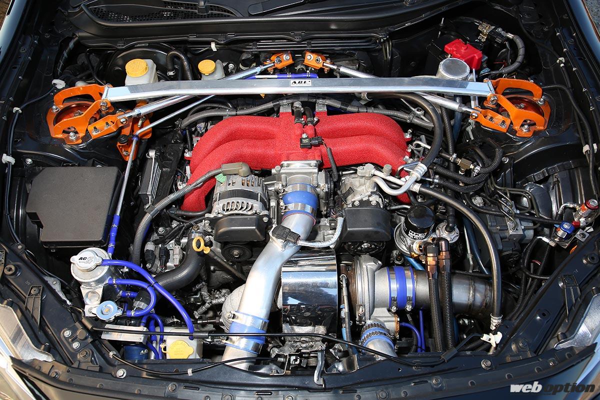 エンジンはマーレー製カスタムピストンとマンリー製コンロッド、オリジナルロングストローククランクによる2.1L仕様。高出力対応のVABエアフロとオリジナルECUセッティングにより、全域エアフロ制御を実現、ストリート仕様として万能といえる手法だ。タービンはトラストのTD06-25G、素早く立ち上がるブースト特性でストリートでも使いやすい。
