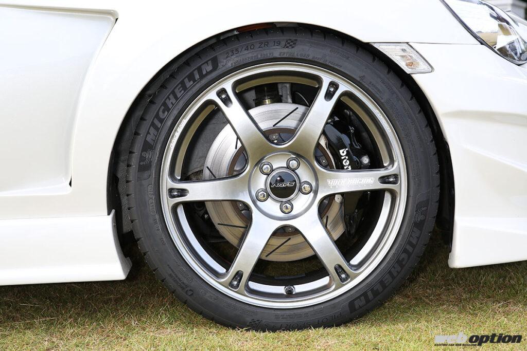 駆動輪はそれまでの265/30-19から、235/40-19に変更、これにより外径が約30mm大きくなる。ノーマルミッションに3.58ファイナルとの組み合わせで、6速7000rpmで322km/hとなる計算だ。