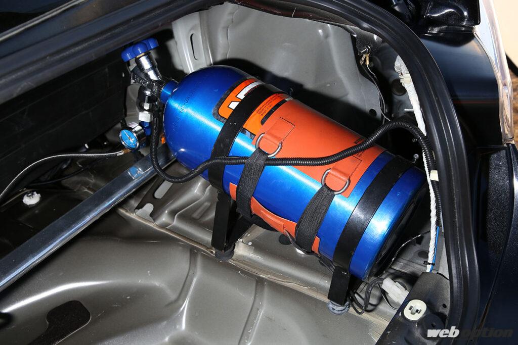 最終兵器として採用したのが、約70psにドーピングが可能になるNOSだ。当初は自動噴射するプログラムを組んで裏ストレートでNOSを使う設定となっていた。しかし、スタッフが常駐するメインストレートでの最高速アタックとなっため、手動噴射式に変更された。