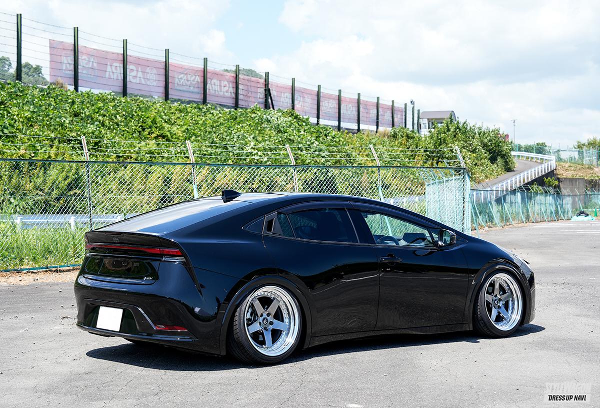 以前の愛車となる30プリウスでも純ベタ(純正スタイルでベタベタの車高)の生足セッティング(車高調)を目指していたが、低さ追求や攻めのホイールマッチングにはトーションビームよりも左右独立となったダブルウィッシュボーンが有利と判断し、60プリウスへ乗り換えた岩瀬さん。ブラックボディの純ベタに深みと逞しさが映えるワークジスタンス・W5Sは、前後キャンバー7度で9.5Jをアウトリップ気味に履きこなした。なお、リムよりも少し黒みがかった色合いとなるブリリアントシルバーのディスクカラーは、さりげなく足もとにメリハリを生み出す好アクセント。今後の目標に掲げている低さ追求で存在感と迫力をどれだけ高めていくのか、アップデートが非常に楽しみな一台だ。