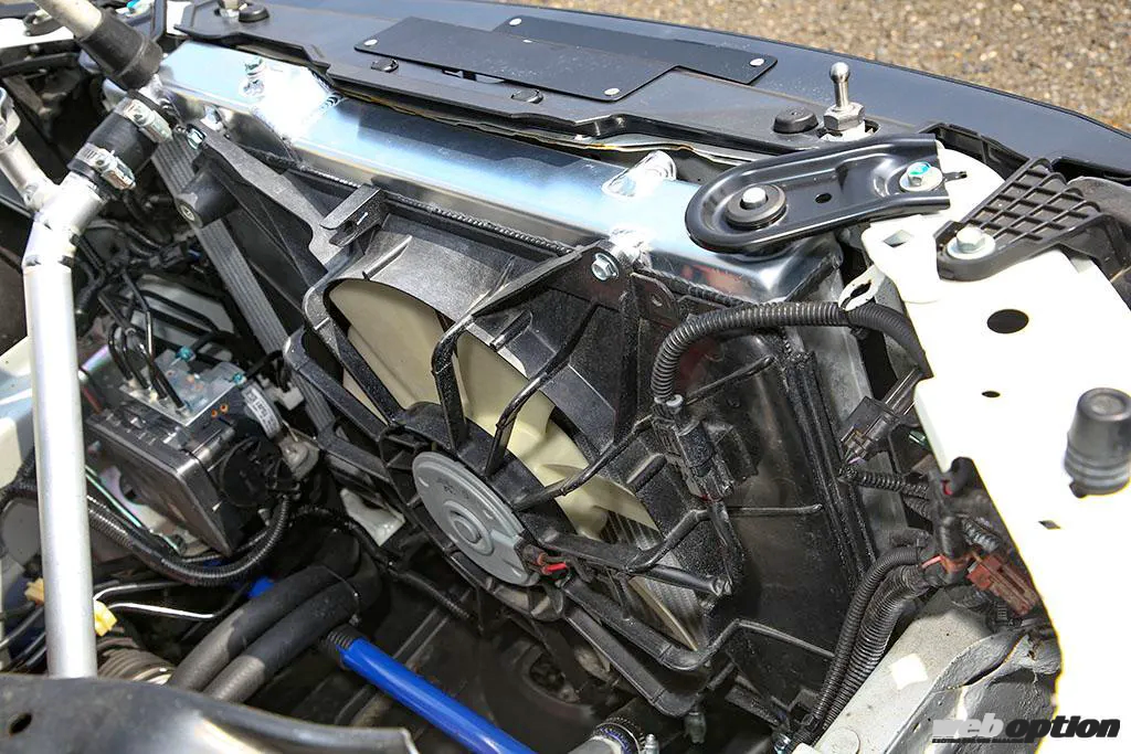 旋回性に影響するフロントは、他車流用のハーフサイズとしたラジエターで軽量化を敢行。電動ウォーターポンプも常時回転させているため、走行風で積極冷却できるラジエターをサイズダウンしても水温は一切問題ない。