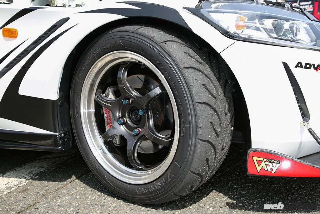 タイヤはアドバンA050のGSコンパウンド。タイヤの外径サイズに理想的な設定がないことから、フロント195/50-15&リヤ205/45-16としている。ホイールはアドバンレーシングRG-D2(F6.5J+42 R7.0J+42)を履く。