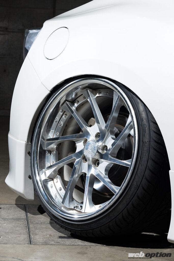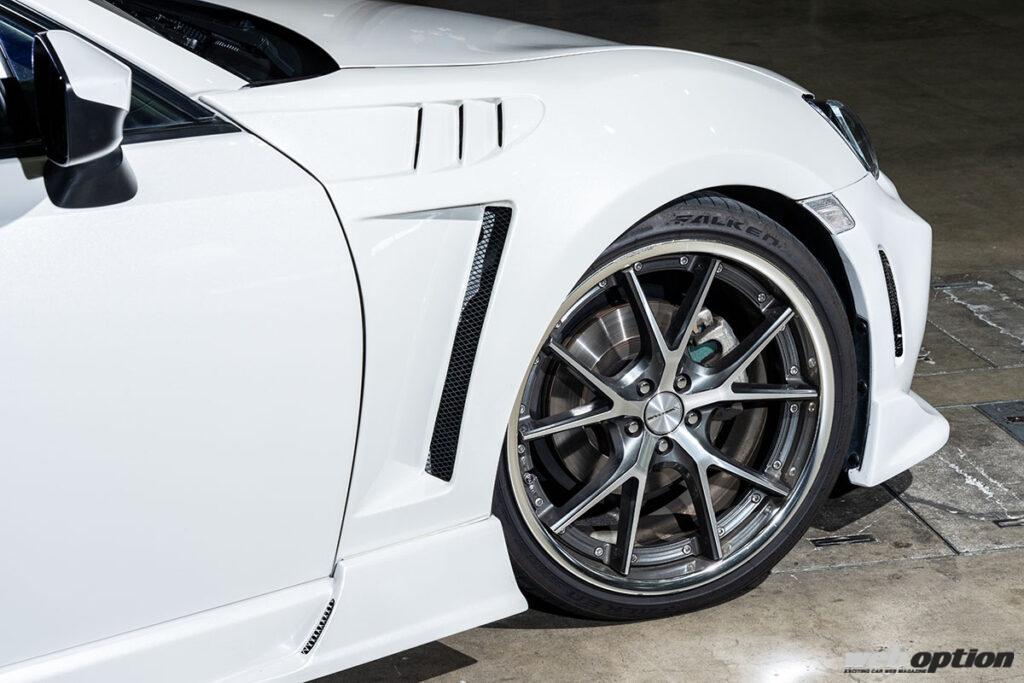 人気車種ゆえに、スタイリングが被りにくいようエアロパーツはブランドミックスで構築。ボトムの統一感を熟慮して、イングス×クールのWブランドで決めている。フェンダーダクトでスポーティさを際立たせた足元には、19インチのウェッズマーベリック905Sをマッチングさせた。