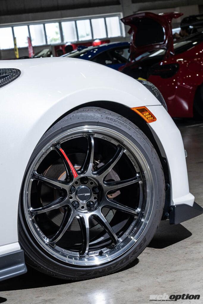 ツメ処理+αでどこまで攻められるかにチャレンジしている生足仕立ての足元には、ツイストデザインが躍動感を生むブロケイドBL15を前後9.5Jでマッチング。ブラッシュドリムで質感の異なる深みを放つルーフラックのスペアホイールなど、細かな魅せ技でギャラリーを魅了する。