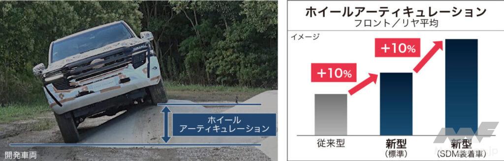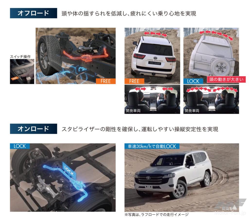 車軸の前から後ろに搭載位置が変わったフロントのスタビライザーには、新デバイスが盛り込まれている。SDM(Stabilizer with Disconnection Mechanism)だ。レクサスブランドも含め、トヨタ自動車として初採用である。ランクル300シリーズにはフロントとリヤのスタビライザーのオン/オフを電子制御で自動的に切り換えるE-KDSS(Electronic-Kinetic Dynamic Suspension System)が設定されている。オンロードではスタビライザーを自動的にオンにして過度なロールを抑えて走行安定性を高め、オフロードではスタビライザー効果をオフにし、荒れた路面に車輪が追従して走破性を高める機能だ。