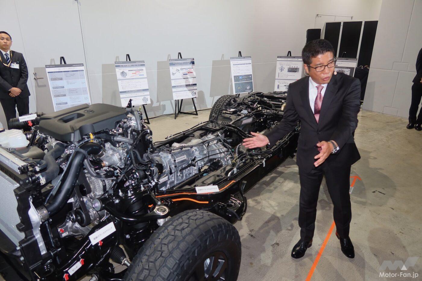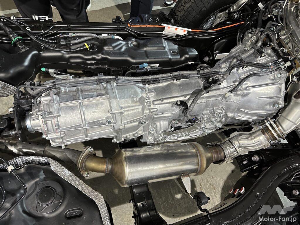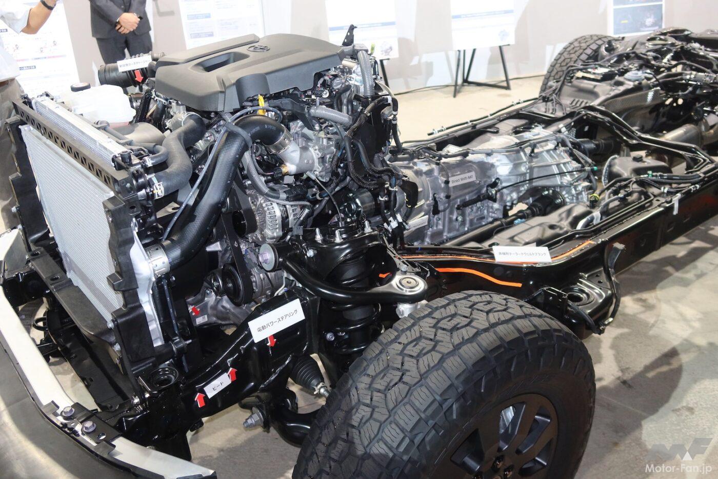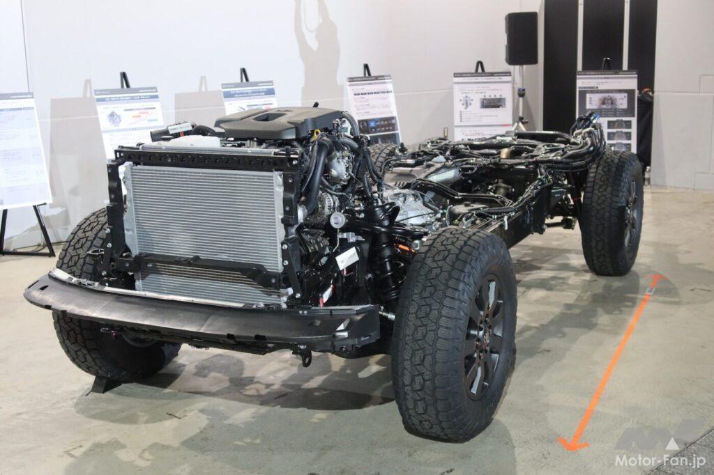 「原点回帰」をテーマに開発されたランドクルーザー250シリーズの発表会場には、ベアシャシーが展示されていた。ランドクルーザー300シリーズやレクサスLX、レクサスGX(国内未導入)と同じGA-Fプラットフォームだ。いわゆるラダーフレーム構造である。展示されていたベアシャシーには、ランドクルーザー250シリーズに設定されている3種類のエンジンのうち、国内に導入予定の1GD-FTV型2.8L直列4気筒ディーゼルターボを搭載していた。