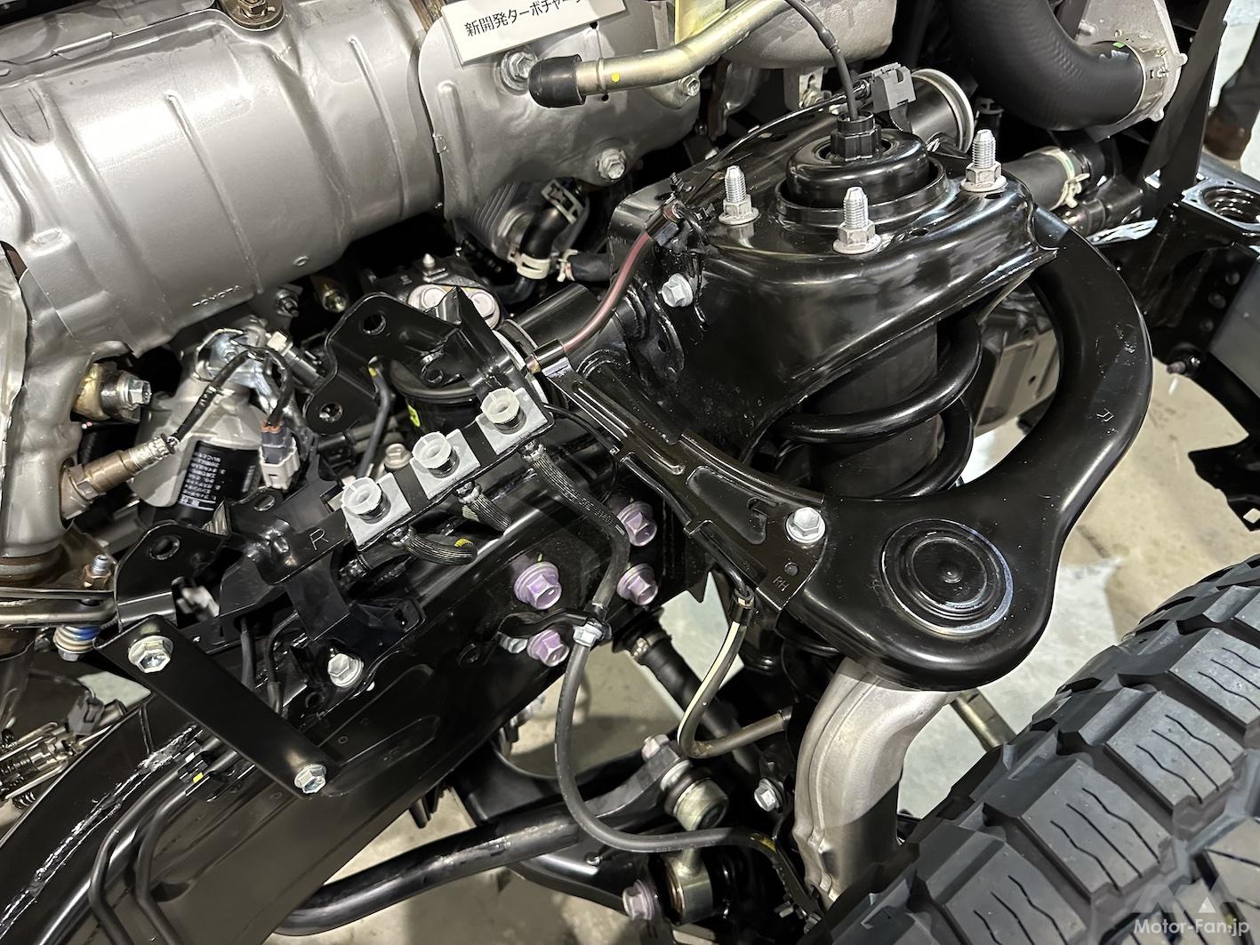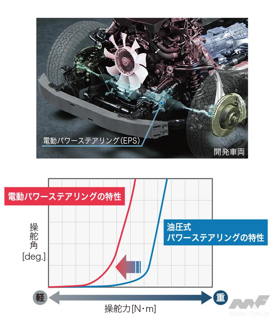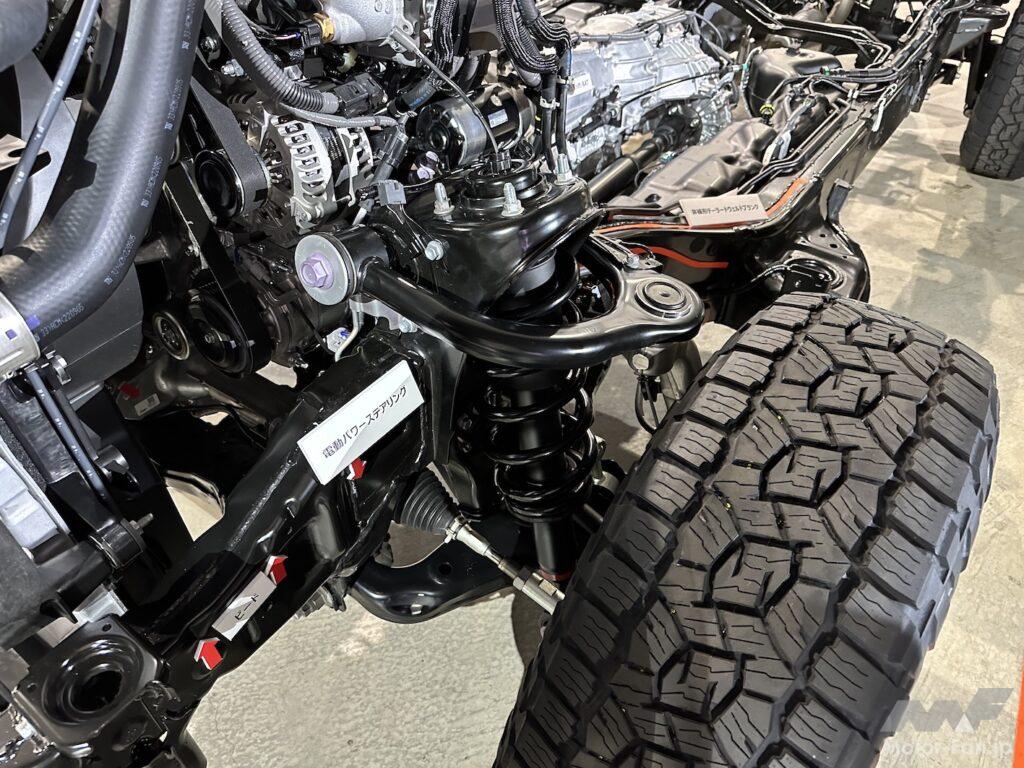 パワーステアリングは従来の油圧式から、ランクルブランドでは初となる電動パワーステアリング(EPS)となった。ベアシャシーを確認すると、アシスト用モーターの配置から、電動モーターをラック(ステアリングギヤボックス)と平行に配置してアシストするラックパラレル式であることがわかる(ジェイテクト製)。パワートレーン縦置きレイアウトの定番で、ラック〜タイロッドを車軸より前に配置する前引きとなっている。