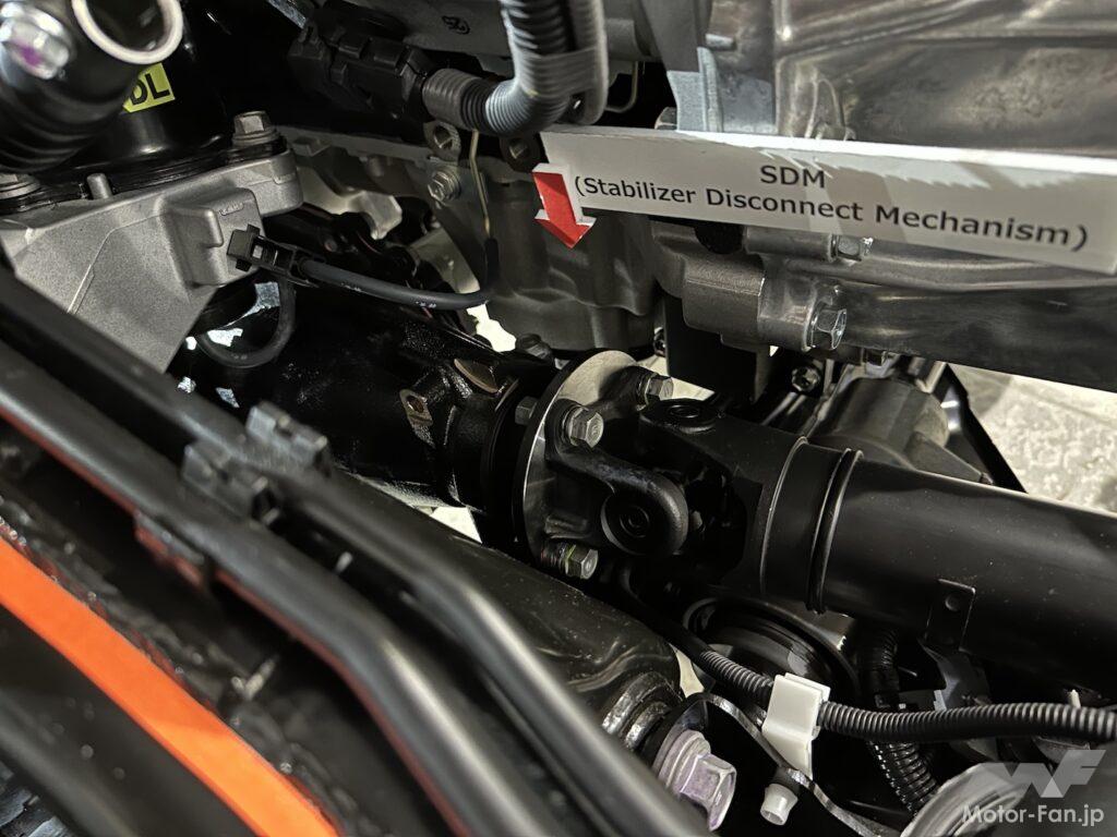 SDMはE-KDSSの簡易機能版と理解すればいいだろう。狙っている効果は同じだが、重量やコストの観点から新デバイスの開発に取り組んだというわけだ。フロントスタビライザーのオン/オフ切り替えはE-KDSSのように自動ではなく、スイッチによるマニュアル操作で行なう。