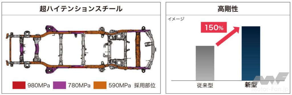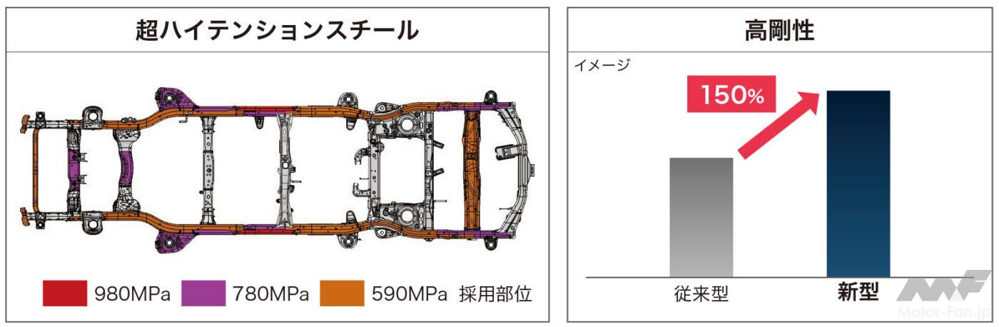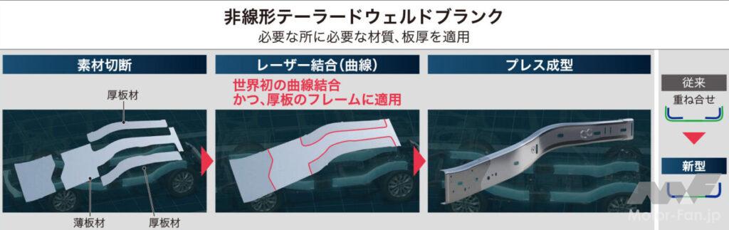 フロントサスペンションのパートで衝突安全性について触れたが、ラダーフレームには高い強度と剛性を実現しながら軽量化も達成する非線形テーラードウェルドブランクを適材適所に採用している。ランクル300シリーズで適用済みの技術で、世界初だ。