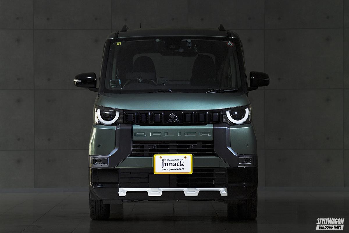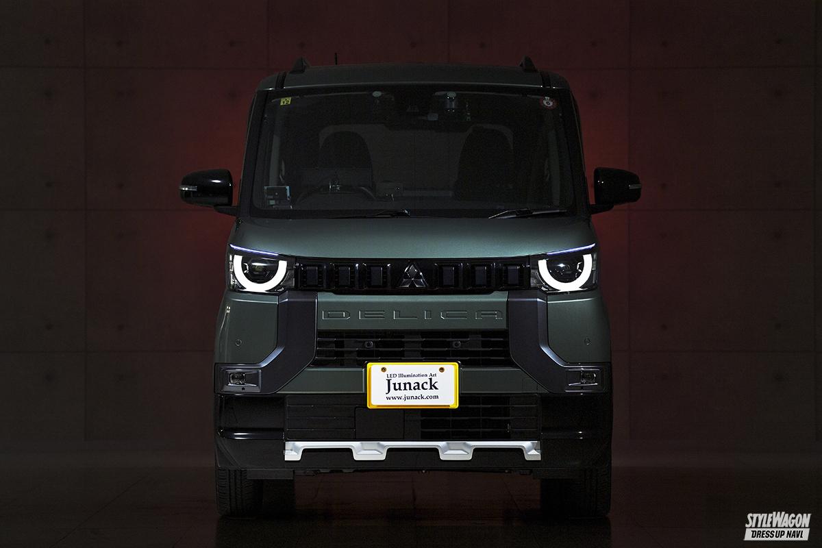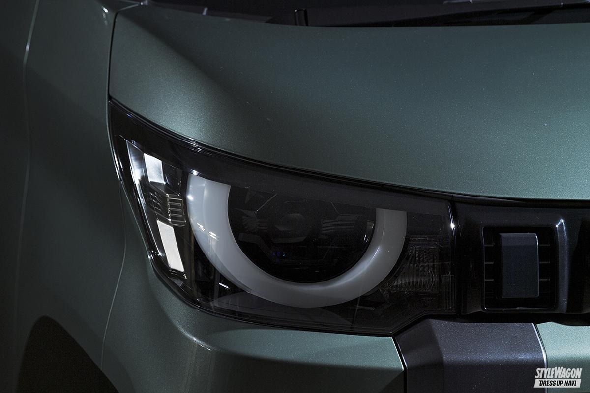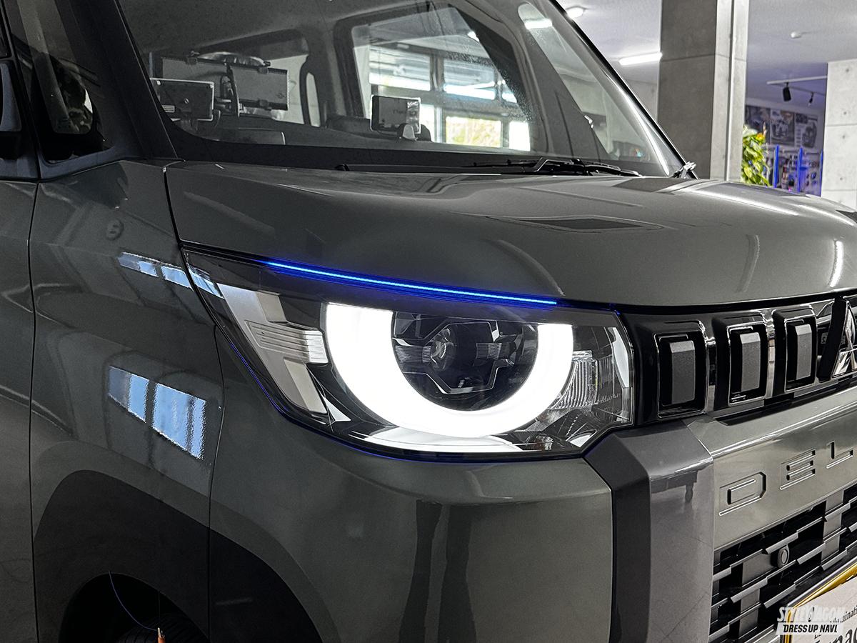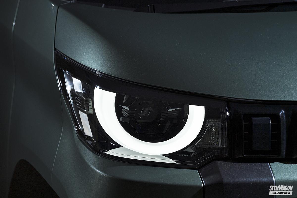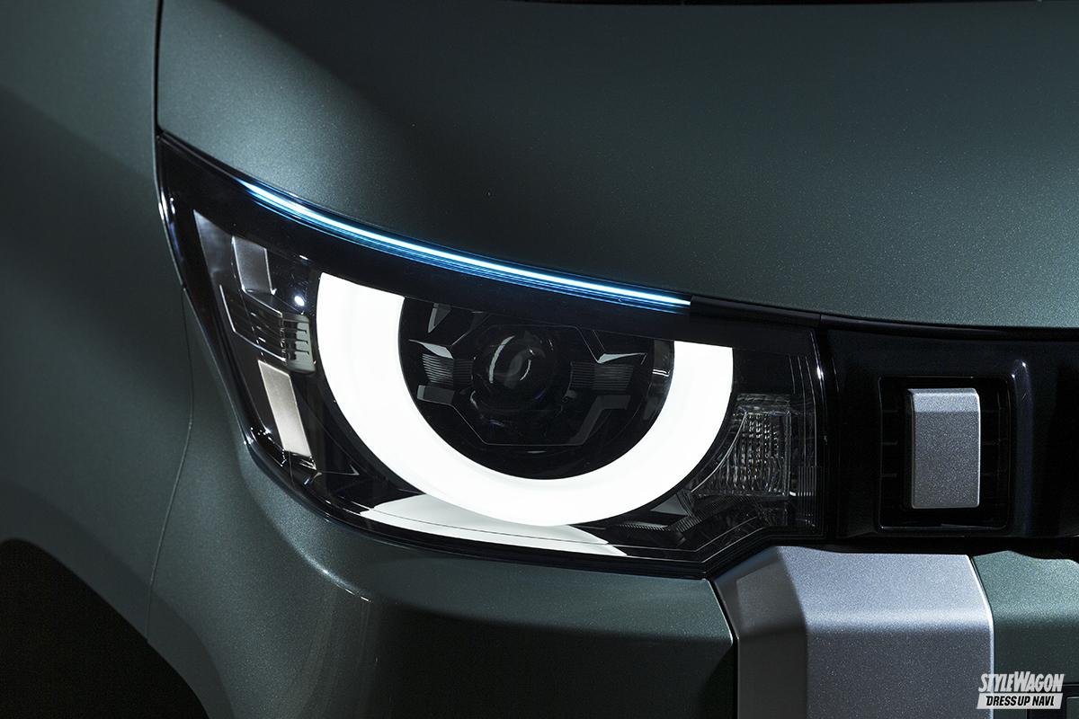 今回はデリカミニにフォーカス! ベース車の個性に合わせユニークなアイテムを設定しているのだ。デリカミニには象徴的なキャラ『デリ丸。』がいる。その『デリ丸。』感を強調する(!?)アイテム〝デリまゆ〟『リ・ザード アイブロー』を開発。この眉があることで、より生き物感がアップ=『デリ丸。』感が強調されるというワケ。しかもクールなブルー、個性的なシアン、シックなホワイトと色味も3種類をラインアップ。そのほかの光のカスタムに合わせて選択できる体制が整う点もポイントだ。