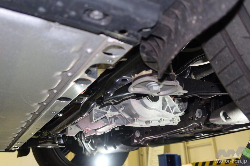 走行プログラムに移る前に、リフトアップしたID.4のモーター搭載部を見せてもらった。「モーターはリヤに搭載」との説明を受けると、モーター本体は後車軸より後ろにあるものと早合点しがちで、実際、他社にはハイブリッド車(HEV)も含めてそういうレイアウトの車両はある。だがID.4の場合は違って、モーター本体は後車軸より前にある。つまり、実質的にミッドシップレイアウトだ。