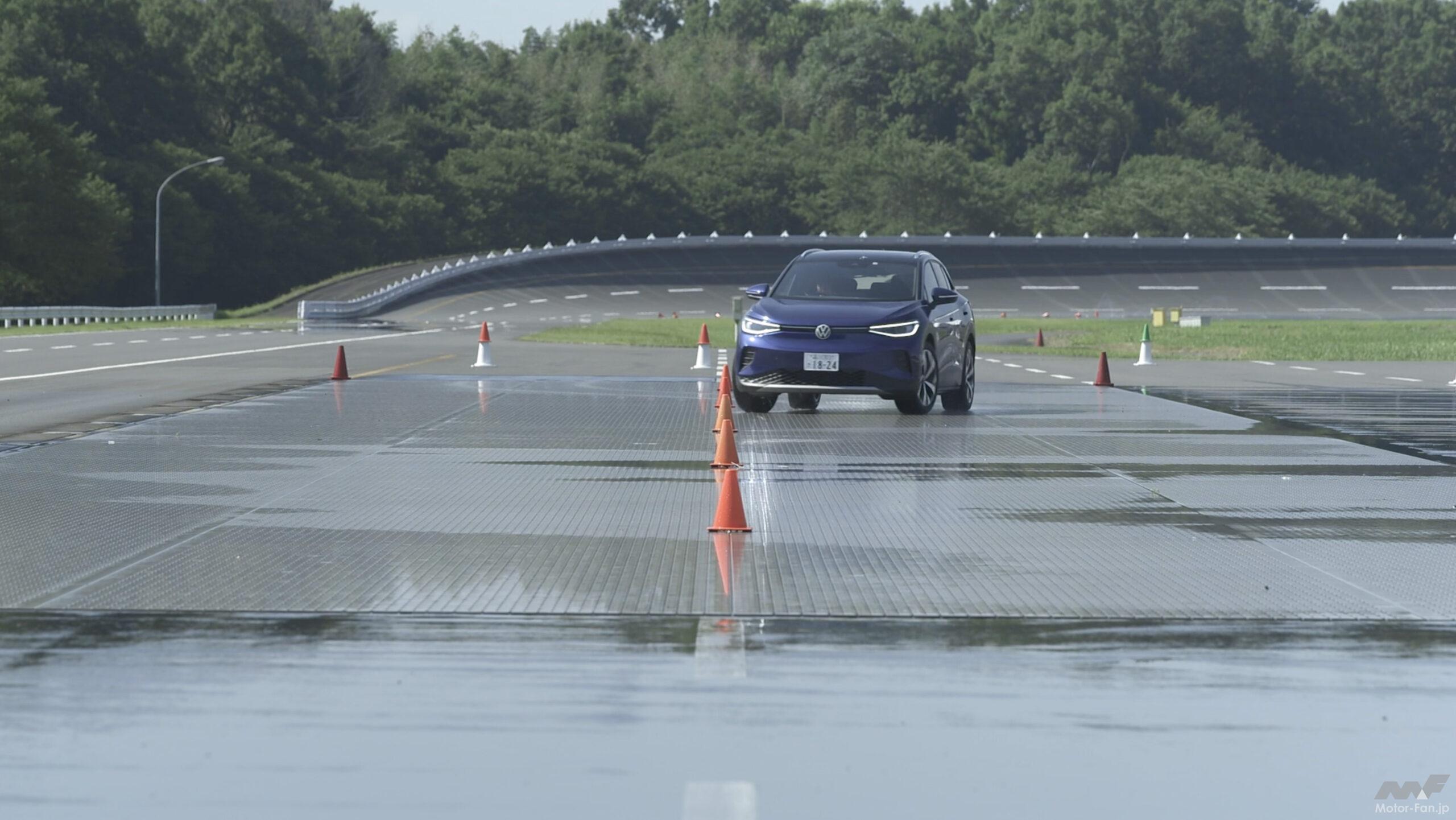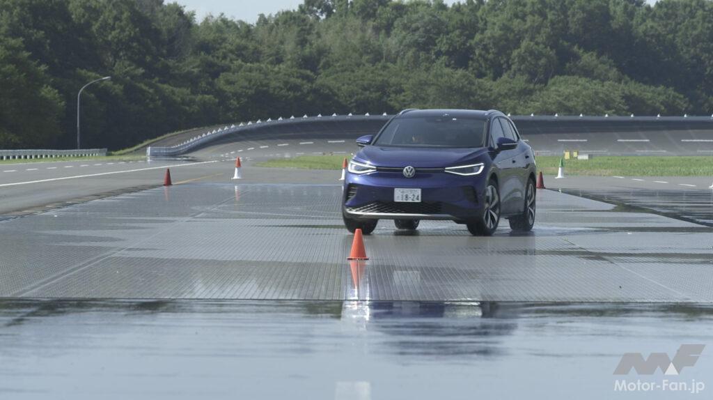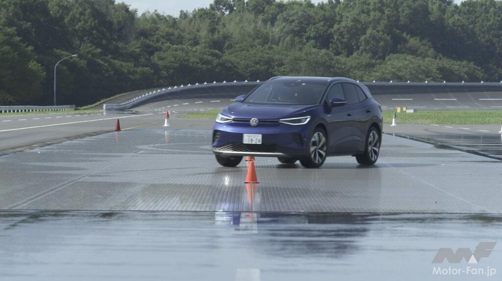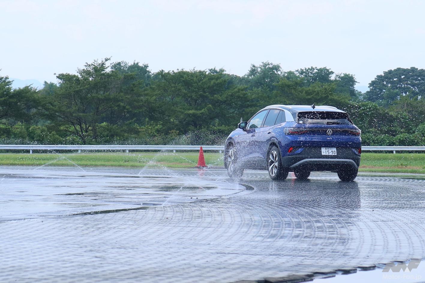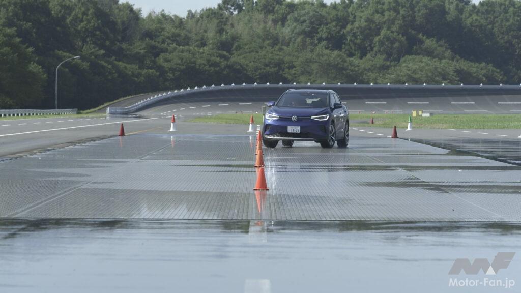 こうした特徴を持つMEBアーキテクチャーの走りを体感するプログラムが「Volkswagen Tech Day 2023」と題され、GKNドライブラインジャパンのプルービンググラウンド(栃木市)で開催された。用意されたID.4は77kWhの総電力量を持つ仕様(一充電走行距離561km)で、リヤに搭載するモーターの最高出力は150kW、最大トルクは310Nmである。