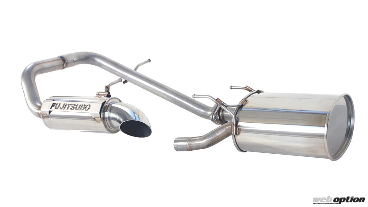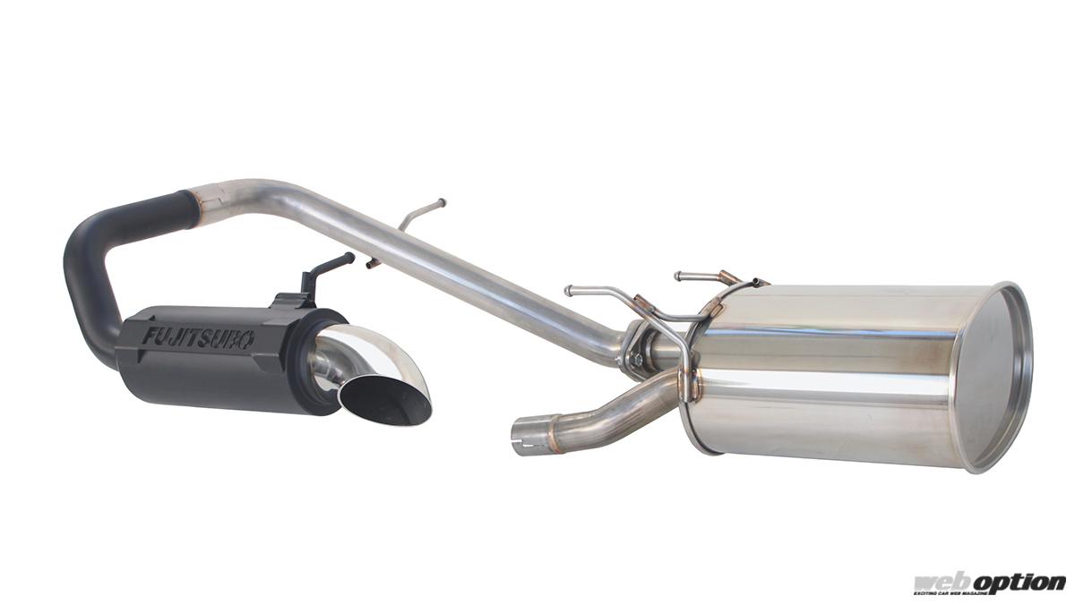 完全専用設計となるサイド出し+スラッシュカットテールレイアウトはインパクト抜群。もちろん性能面にも大きく貢献し、フジツボのテストでは最高出力が50.3ps→51.7ps、最大トルクが5.1kgm→5.4kgmというスペックアップを記録している。