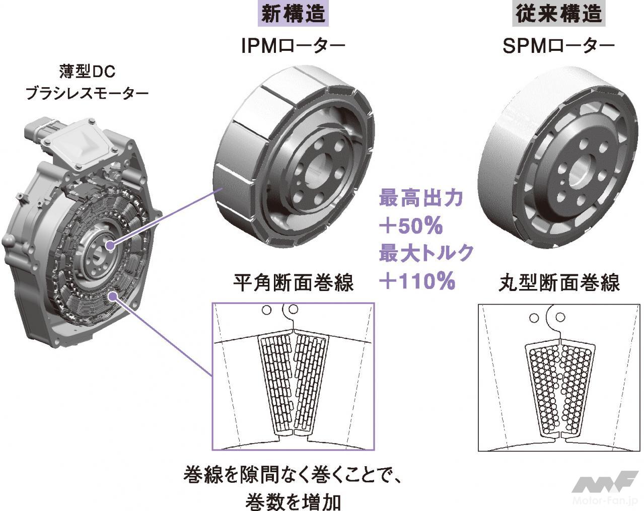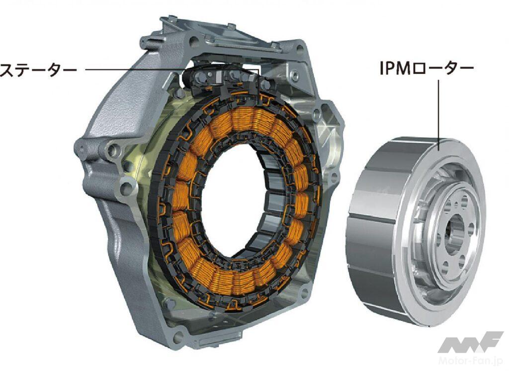 モーターは鈴鹿製作所で製造する。2005年のシビック・ハイブリッドから、ステーターに巻くコイルを丸断面から平角断面に変更した。丸断面よりも密に巻ける。率にして4%の向上分。ターゲットとする出力を得るために必要な数値だったが、生産効率を3倍に上げる必要があった。これが課題。コイルを巻く芯も四角い。同じ速度でヘッドを回転させると巻き付き速度が変わってしまうので、芯とヘッドの動きを絶妙に制御し、速く、きれいに巻けるようにした。※図版は2代目シビック・ハイブリッドのもの。