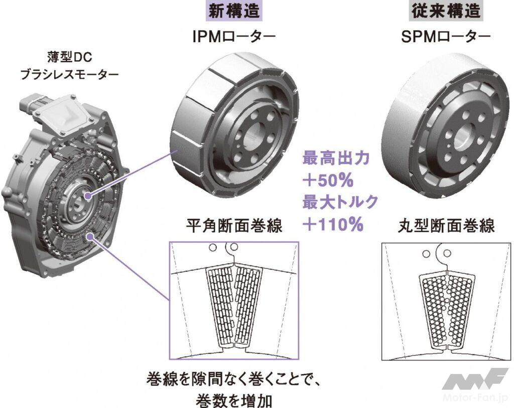 2005年のシビック・ハイブリッドから、コイルの巻き線を丸断面から平角断面にして、効率を高めている。ハイブリッドを大衆化するためには従来の3倍に生産効率を引き上げなければならない。ざっと試算すると1日1000台。稼働10時間として1時間に100台である。「安く作るならまず平角線を止めること」という製造サイドの声を押しとどめて、3倍速く巻ける技術を確立した。